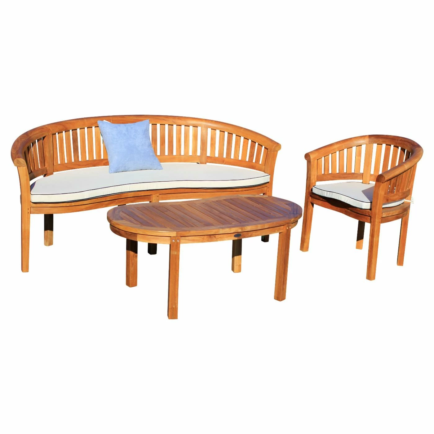 Make your deck a comfortable place for enjoying everything from autumn afternoons to summer nights with the Chic Teak Peanut Teak Wood 3 Piece Patio Conversation Set. A wide, three-person bench, curved armchair, and kidney-bean-shaped coffee table are included in the set. Each piece is rendered from block teak wood with stainless steel hardware. Teak is naturally resistant to sun, rain, and snow, made even more resilient with a honey-brown finish. The seats are padded with foam and upholstered in mildew-resistant, quick-dry white Sunbrella.