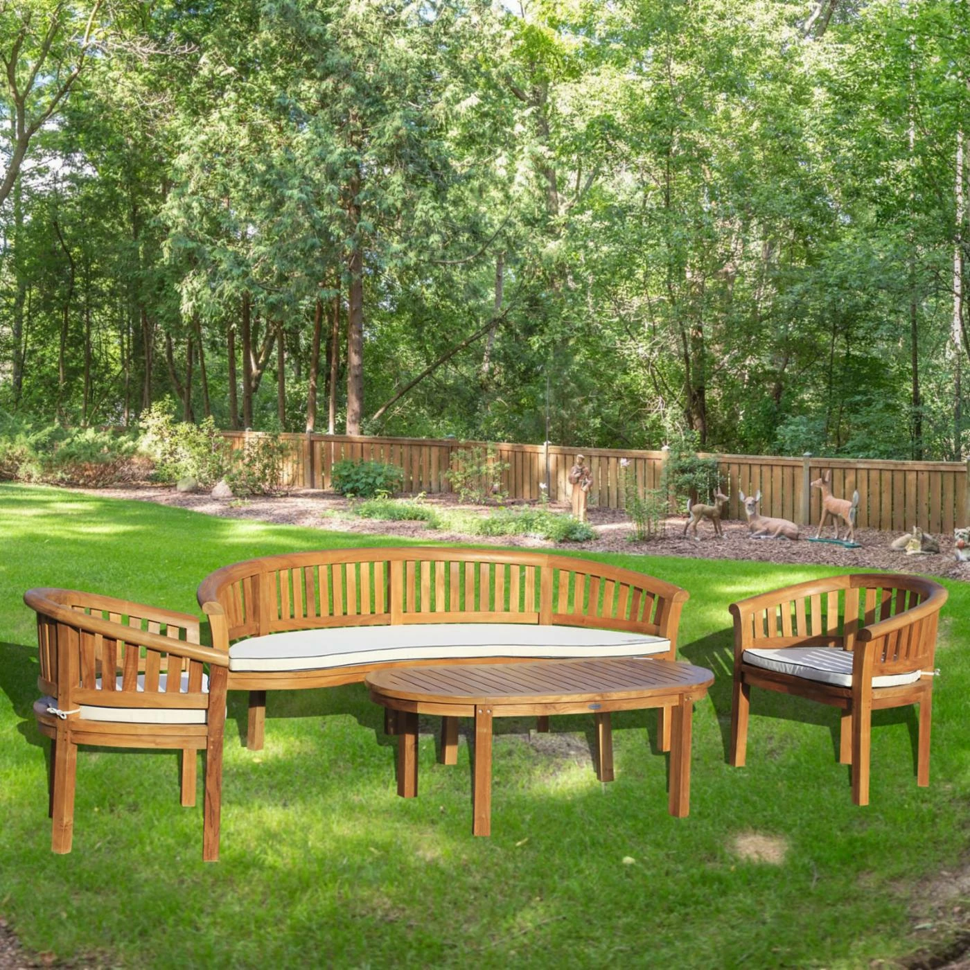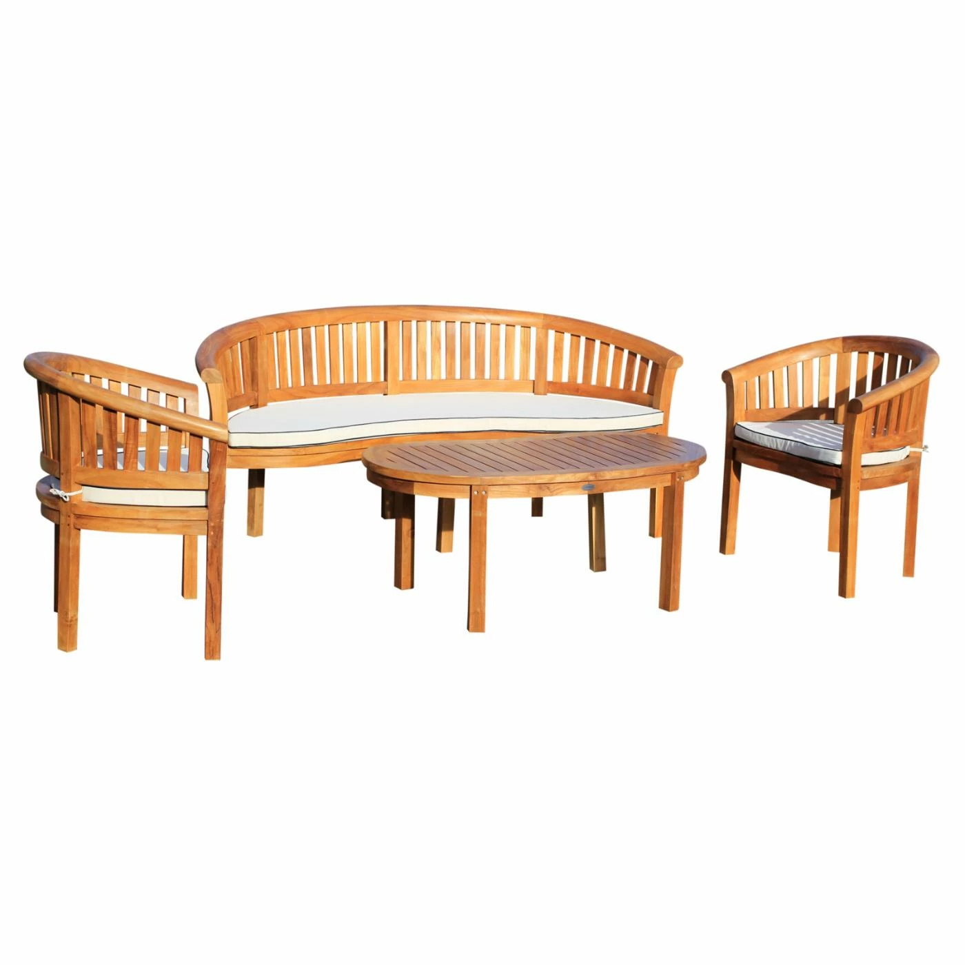 Provide your poolside patio with the Chic Teak Peanut Teak Wood 4 Piece Patio Conversation Set for a casual, coastal way to provide seating for everyone on your guest list. A three-person bench, two armchairs, and a coffee table are included. Solid Grade-A teak is used to construct the piece, finished in honey-brown. The frames wonβt fade, warp, or rot in the weather. Each seat comes with an all-weather white Sunbrealla cushion padded with foam.