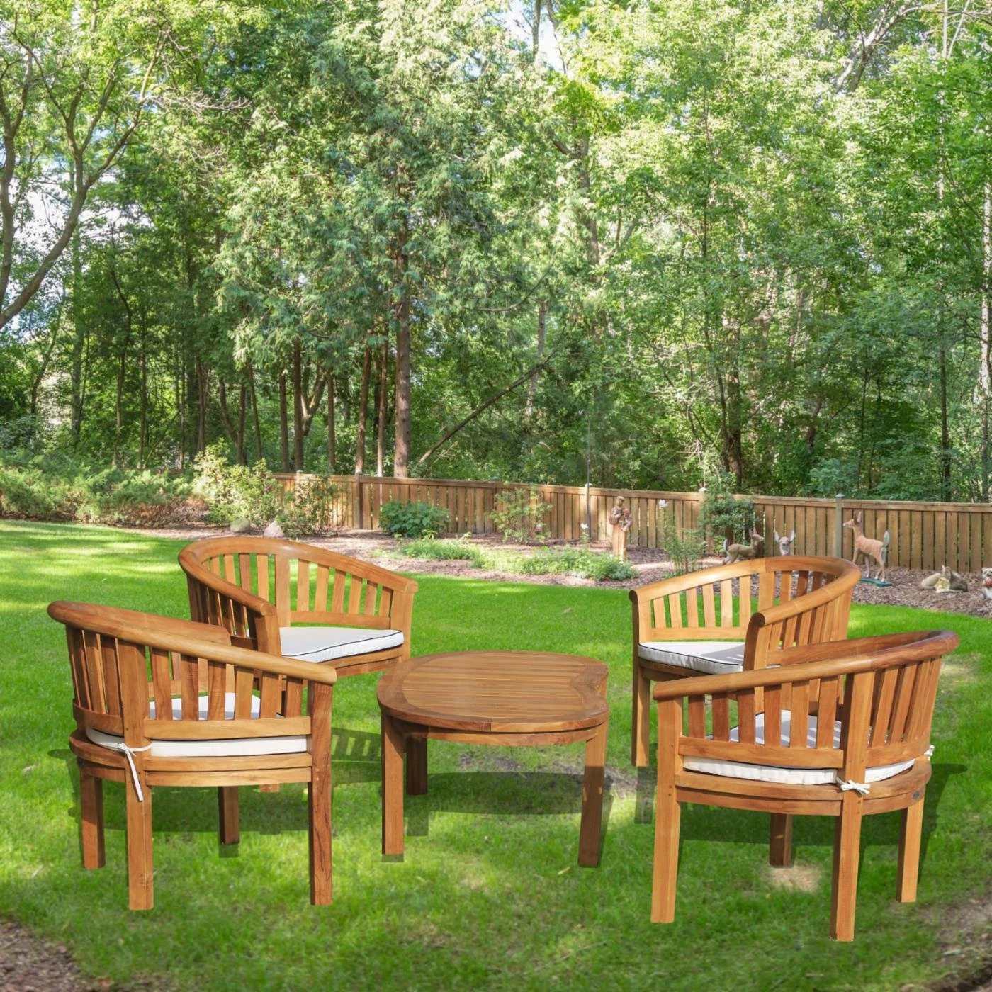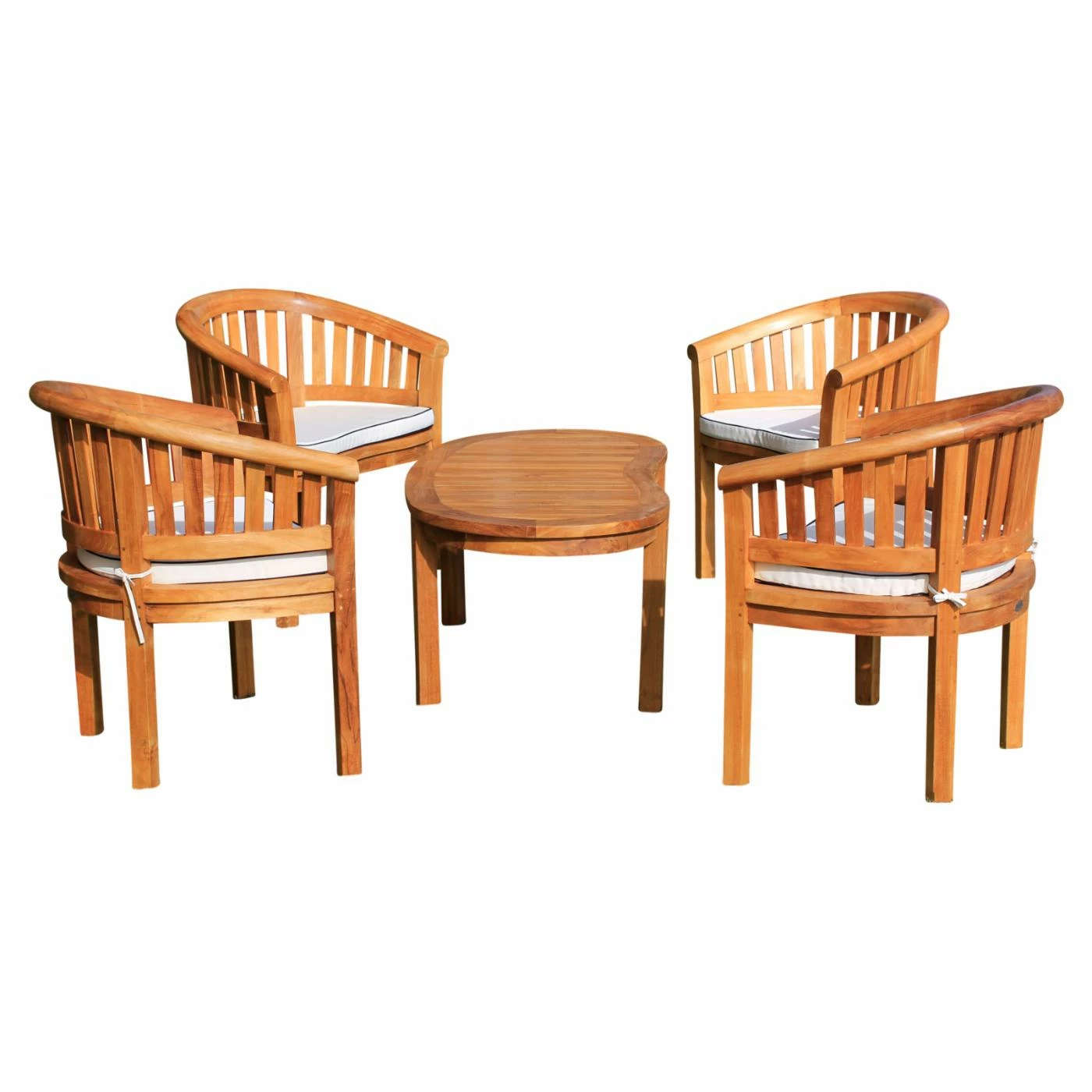 Craft a spot for enjoying the sunshine and summer breeze with family and friends thanks to the Chic Teak Peanut Teak Wood 5 Piece Patio Conversation Set. Four matching armchairs and a kidney-shaped coffee table are included in the set. Each piece is rendered from weather-resistant teak and stainless steel hardware, finished in honey brown. The chairs all come with foam-padded weatherproof white Sunbrella cushions.