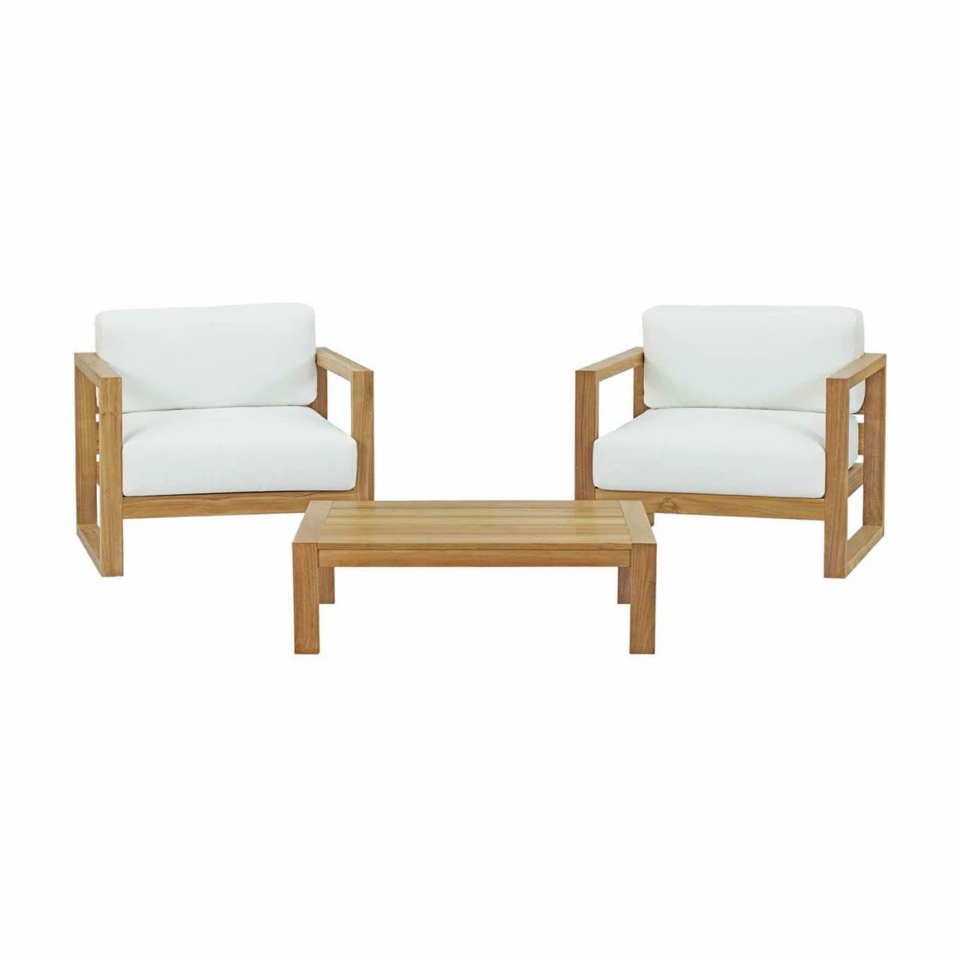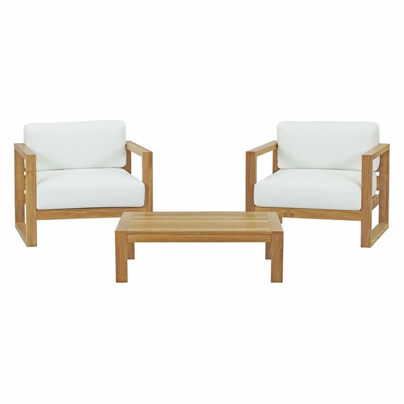 The Modway Upland Teak 3 Piece Outdoor Patio Conversation Set with Coffee Table is an easy and opulent way to add comfort and style to any outdoor space. This set includes two chairs with thick cushions and a matching coffee table. The strong, straight angles give it a clearly modern appearance. Each piece has a frame that’s made from solid teak hardwood with a natural finish. The cushions are filled with moisture-resistant, high-density foam that’s perfect for any climate. The removable cushion covers are UV-resistant and can be machine-washed for easy cleaning. Teak wood is also a great choice for outdoor furniture because it’s naturally resistant to insects and moisture-related damage.
