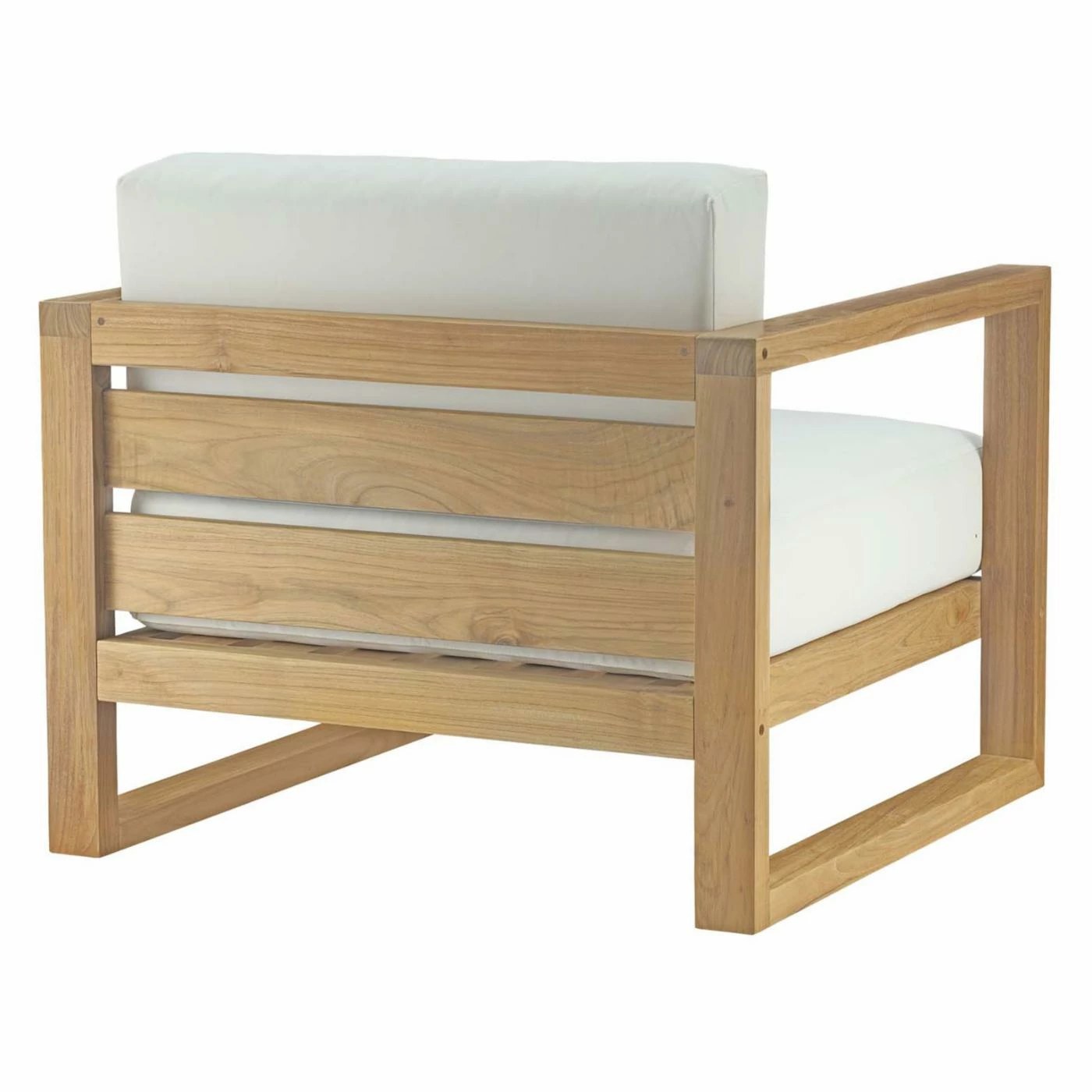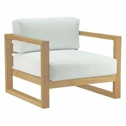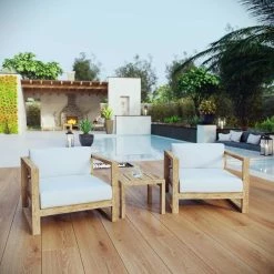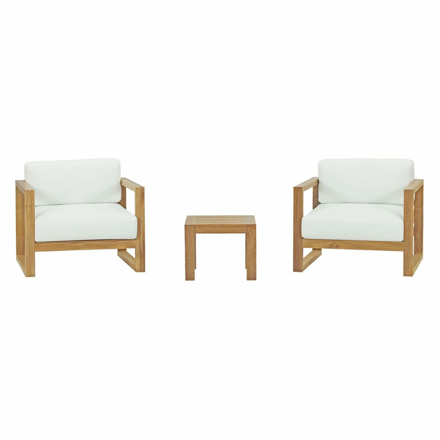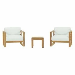 The Modway Upland Teak 3 Piece Outdoor Patio Conversation Set with End Table is going to bring the feeling of a high-end resort to your porch, patio, or even your apartment balcony. This set includes a pair of arm chairs with a matching side table. Each chair is outfitted with extra-thick seat and back cushions that are filled with high-density foam. The removable, UV-resistant cushion covers come in a crisp shade of white and can also be machine-washed for easy cleaning. The frame of each piece is crafted from solid teak hardwood with a natural finish that lets you enjoy the rich color and tight grain of the lumber. Teak is also a great choice for outdoor furniture because it’s naturally resistant to insects and moisture-related damage.