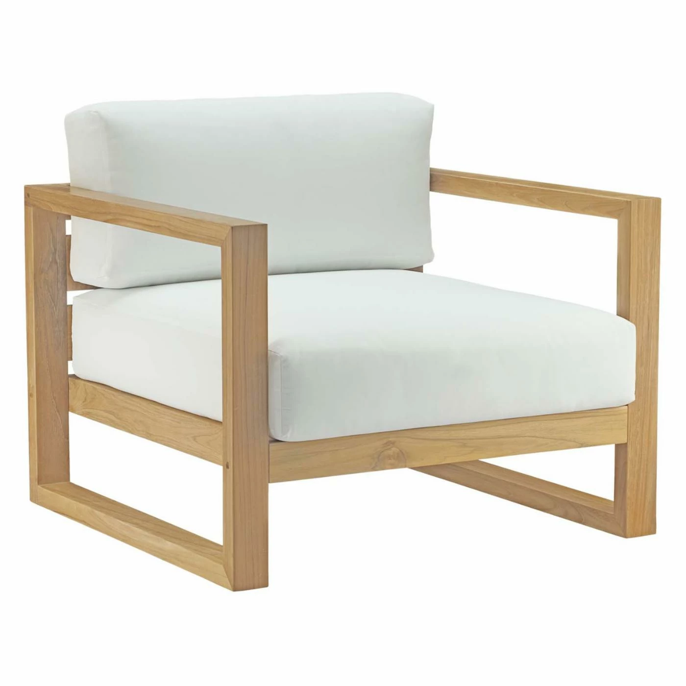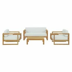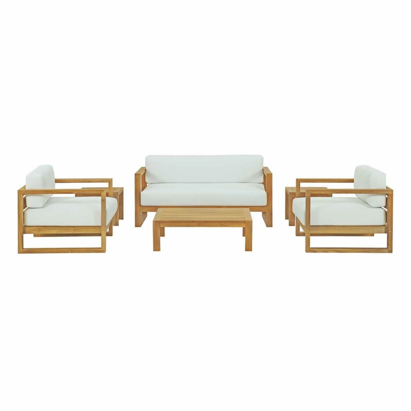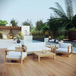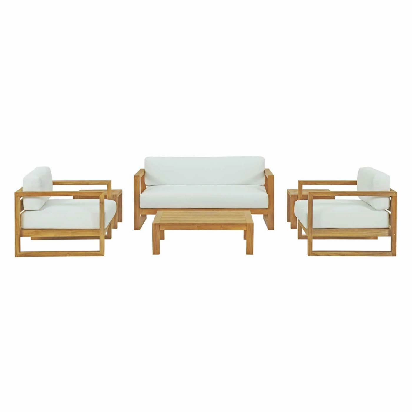 When you’re serious about making the most of your outdoor space, you’ll be glad that you can sink into the deep comfort of the Modway Upland Teak 6 Piece Outdoor Patio Conversation Set. This set includes a sofa, two arm chairs, two side tables, and a matching coffee table. The open, angular shape gives it a modern, minimalist feel. Each piece starts with timbers of natural finished teak hardwood. Adding comfort to the design are thick cushions of high-density, water-resistant foam. The removable, UV-resistant cushion covers come in a crisp shade of white and can also be machine-washed for easy cleaning. Teak is also a great choice for outdoor furniture because it’s naturally resistant to insects and moisture-related damage.