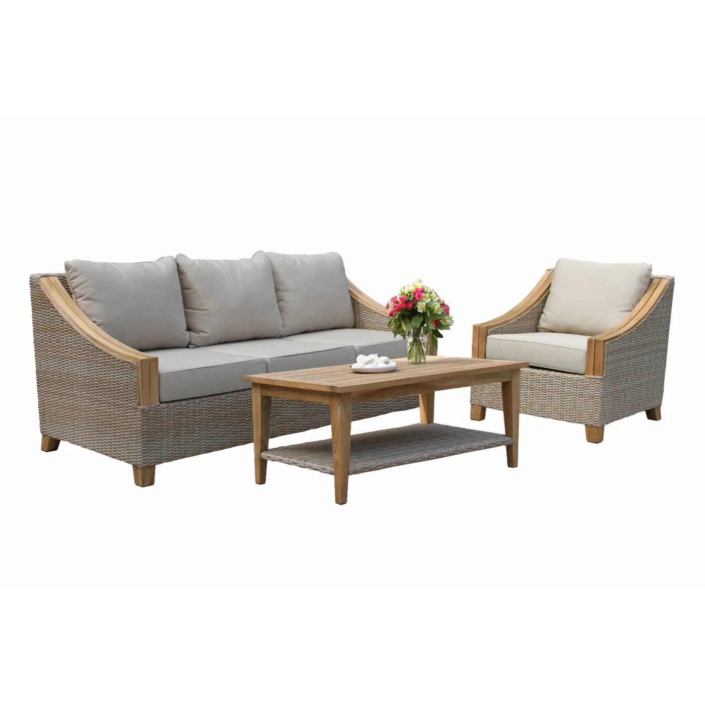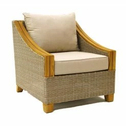 This product is loaded with tons of teak wood and draped in wicker! The sofa is crafted from the highest quality materials starting with FSC plantation-grown teak. The chair and the couch have Sunbrella branded fabrics to complete this set. Features an ash gray cushions with unstained teak frame.
