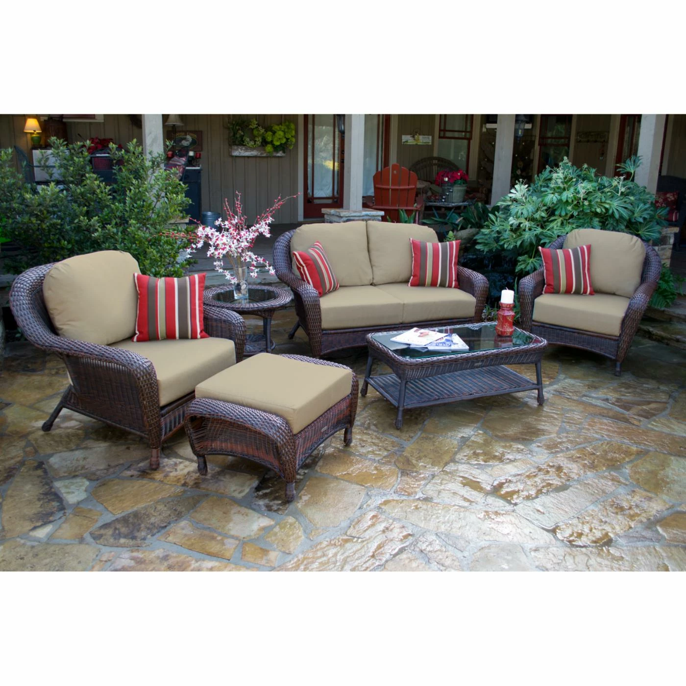 The word ‘tortuga’ means ‘turtle’ in Spanish, an appropriate term for the Tortuga Sea Pines 6 Piece Deep Seating Conversation Set with Loveseat, in which you and your guests can relax and enjoy passing the time languidly. This conversation set offers you all the conveniences of indoor hosting, with plenty of comfortable seating and plenty of surfaces, and all the enjoyment of natural outdoor splendor. The loveseat offers a cozier yet still-roomy option for personal seating. The ottoman can act as a footstool, extra surface, or additional seating for overflow guests. And with two club chairs, an end table, and a coffee table, everyone will have ample personal space for themselves and a book or drink. The two tables even have underneath storage so you stow display items for added functional top space if people need room for appetizer or desert plates. With your choice of finish and fabric color or pattern, you’ll be able to customize this collection to your own personal tastes and build a look that’s entirely you. Because they are made with superior-quality materials, like tempered glass and all-weather synthetic wicker, these pieces are sure to continue looking good year after year and season after season, with minimal care or maintenance.