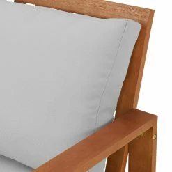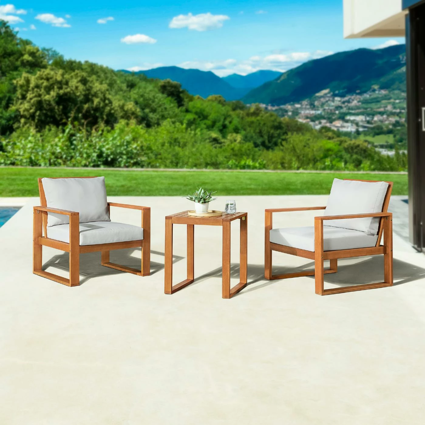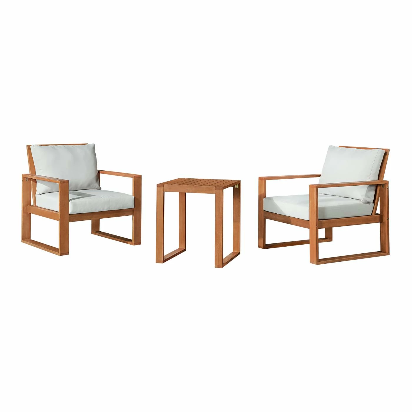 Add style and sophistication to your outdoor living space with this attractive Eucalyptus Wood Conversation Set. The set includes two outdoor chairs and a cocktail table. Frame is made from durable eucalyptus wood that will stand up to varying weather conditions, and the generously padded all-weather cushions will provide luxurious comfort all day long. The neutral wood finish and gray colored cushions will easily match with any accent pieces in your outdoor space creating the perfect outdoor entertainment space!