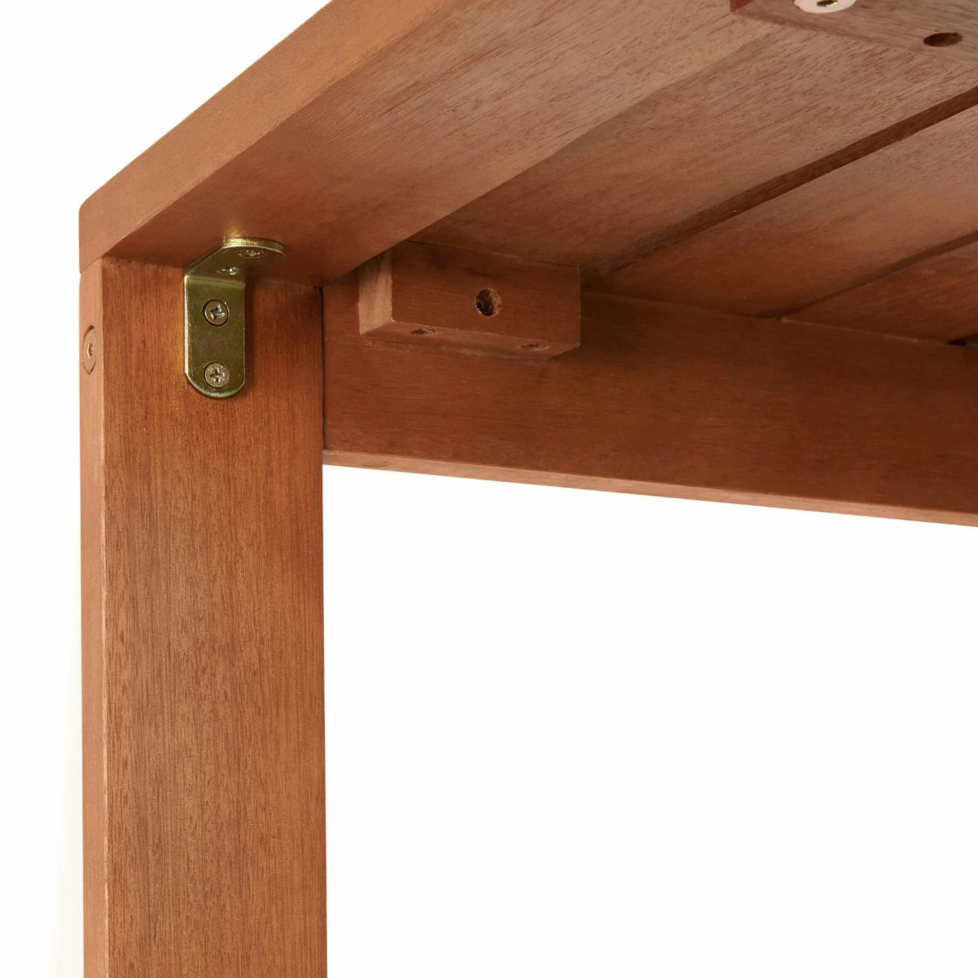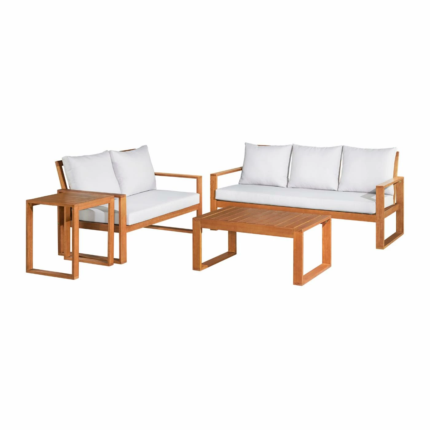 Add style and sophistication to your outdoor living space with this attractive Eucalyptus Wood 4-Piece Set. The set includes a 2-seat bench, 3-seat bench chairs, cocktail table and a coffee table. Frame is made from durable eucalyptus wood that will stand up to varying weather conditions, and the generously padded all-weather cushions will provide luxurious comfort all day long. The neutral wood finish and gray colored cushions will easily match with any accent pieces in your outdoor space creating the perfect outdoor entertainment space!
