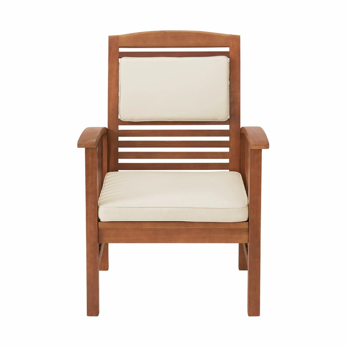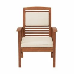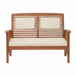 Add style and comfort to your outdoor living space with this attractive eucalyptus wood outdoor conversation set. The set includes 2-Seat bench with cushions, two chairs with cushions and a cocktail table. Frame is made from durable eucalyptus wood that will stand up to varying weather conditions. The bench and chairs include coordinating back and seat cushions that provide luxurious comfort all day long. The neutral wood finish and cream colored cushions will easily accent any outdoor area creating the perfect outdoor entertainment space!