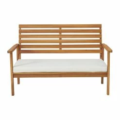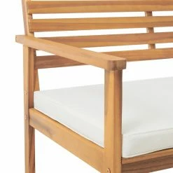 This stylish acacia wood outdoor set provides the perfect spot to relax and enjoy a conversation with friends. Made of acacia wood, this durable set includes a bench and two chairs with comfy water resistant seat cushions and a cocktail table. The chic simple design will refine any outdoor space. The durable acacia wood design is resistant to outdoor elements. The neutral wood finish and natural colored cushion will easily match with any accent pieces in your outdoor space.