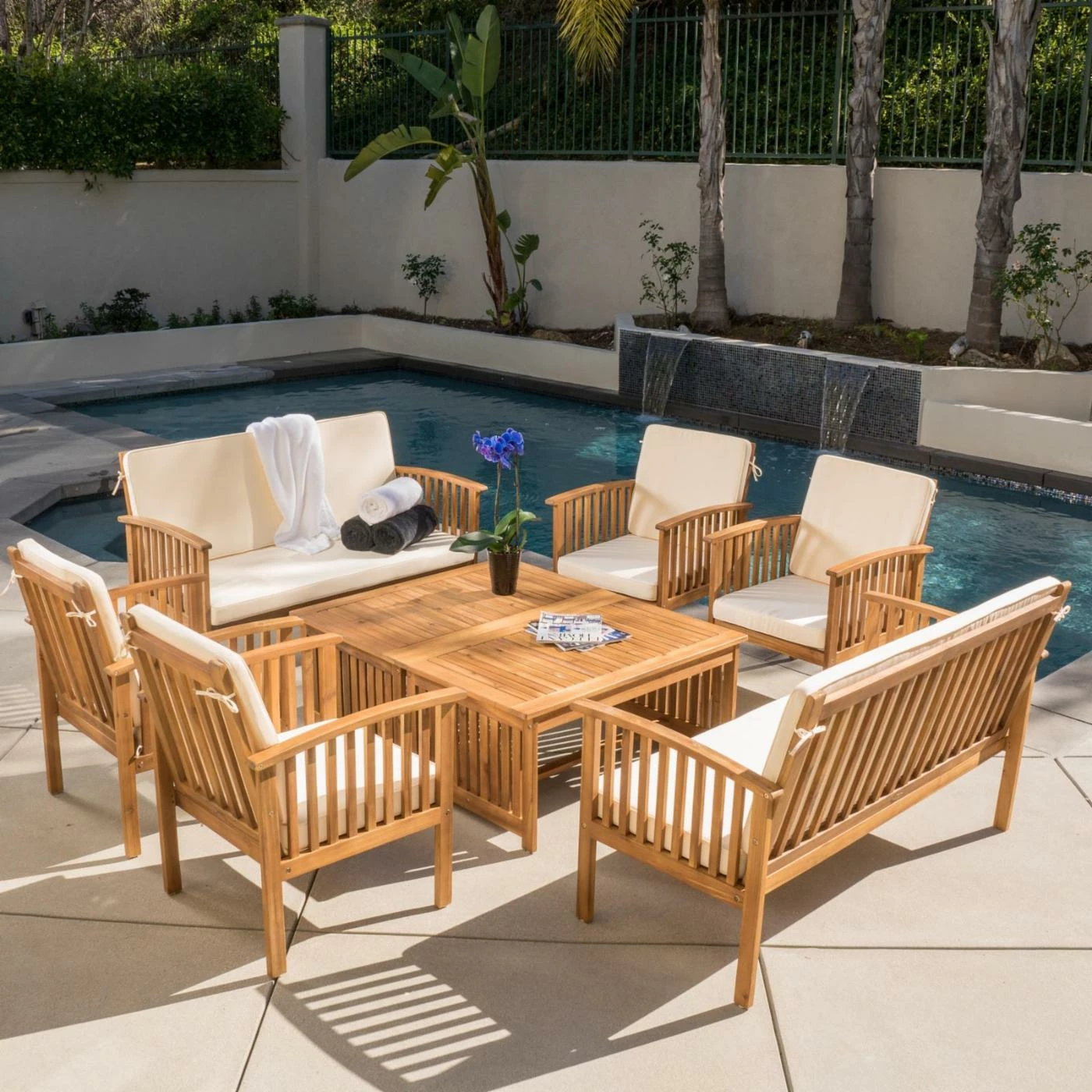 The HN Outdoor Artesia 8 Piece Conversation Set brings pure elegance to your outdoor area with its beautiful construction of sturdy acacia wood. This modern set is accented with a gorgeous brown patina stain finish, and the cushions provide your guests with a comfortable seating space that will stand the test of time so you can enjoy its beauty for years to come.