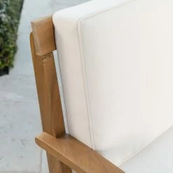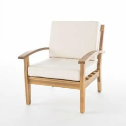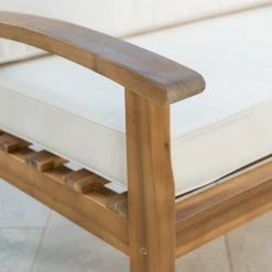 Elevate the ambiance of your outdoor space and offer comfortable seating with this HN Outdoor Brentwood 4 Piece Wooden Patio Chat Set with Cushions. Included in this set are two cushioned chairs, a cushioned loveseat, and a coffee table. All are crafted from naturally weather-resistant acacia wood in a teak finish. Neutral beige cushions are thick and made with waterproof polyester fabric. The coffee table has plenty of room for beverages and decorative touches, too.