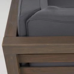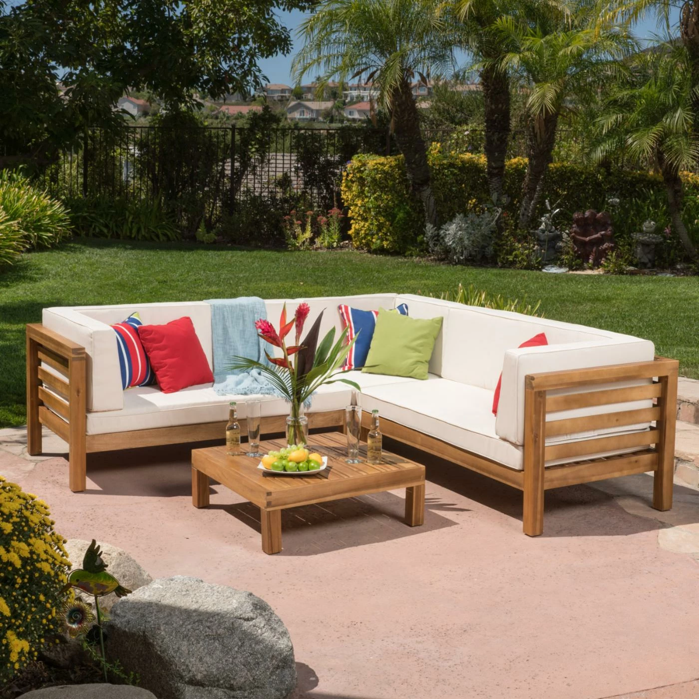 Clean-lined and casual, the HN Outdoor Chandler Wooden 4 Piece Patio Sectional Sofa Set is the spot to stretch out by the pool or under the shade of a patio-side tree. Its four pieces – including left- and right-side benches, a corner bench piece, and a coffee table – are crafted with durable acacia wood, revered for its natural water-resistance outdoors. A classic slatted design allows the set to stay dry, too. Choose from the available finish options; each includes coordinating, water-resistant polyester fabric cushions that can stand up to pool splashes (and lemonade spills). Best of all, you can group the pieces all together or break them apart to create cozy spots around the patio, pool, or garden – or do it all! Assembly is required; a 90-day limited manufacturerโs warranty is included.
