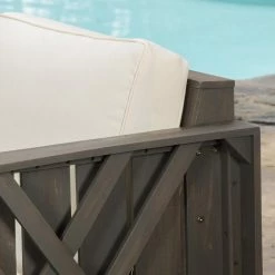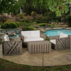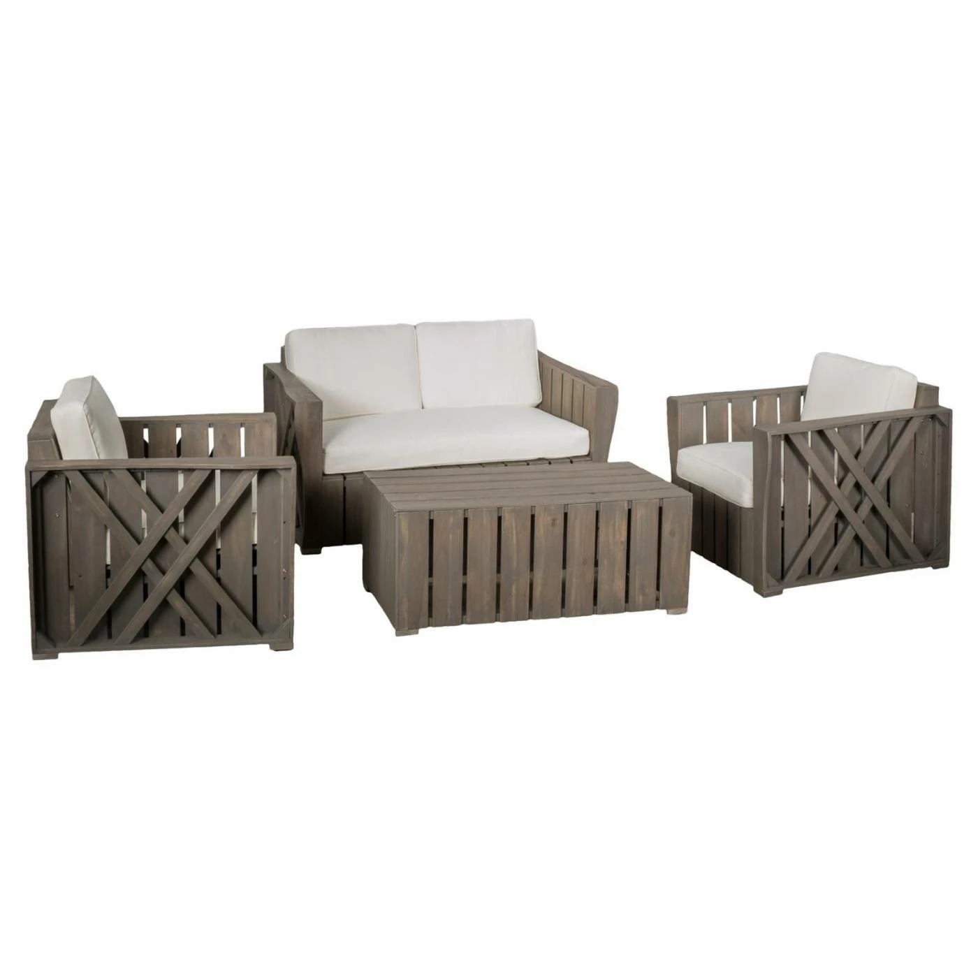 Comfortable and designed to last, this HN Outdoor Gallatin Wood 4 Piece Patio Conversation Set is sure to liven up your home’s patio or deck setting. Made of acacia wood with polyester, this set includes a table, two club chairs, and a loveseat. Designed to seat up to four people comfortably, this patio set is covered in shades of gray and cream for an elegantly understated look and feel.