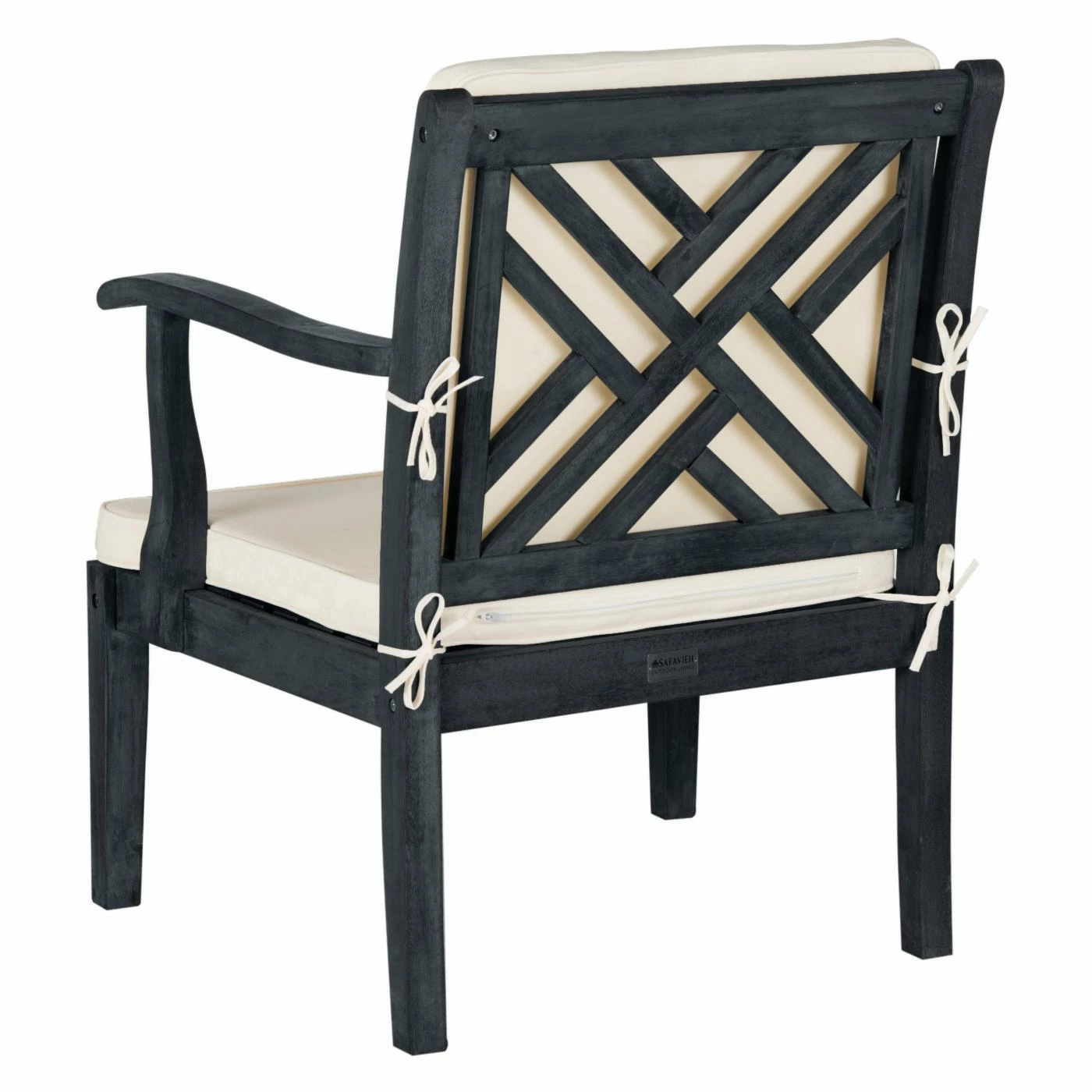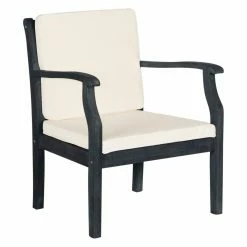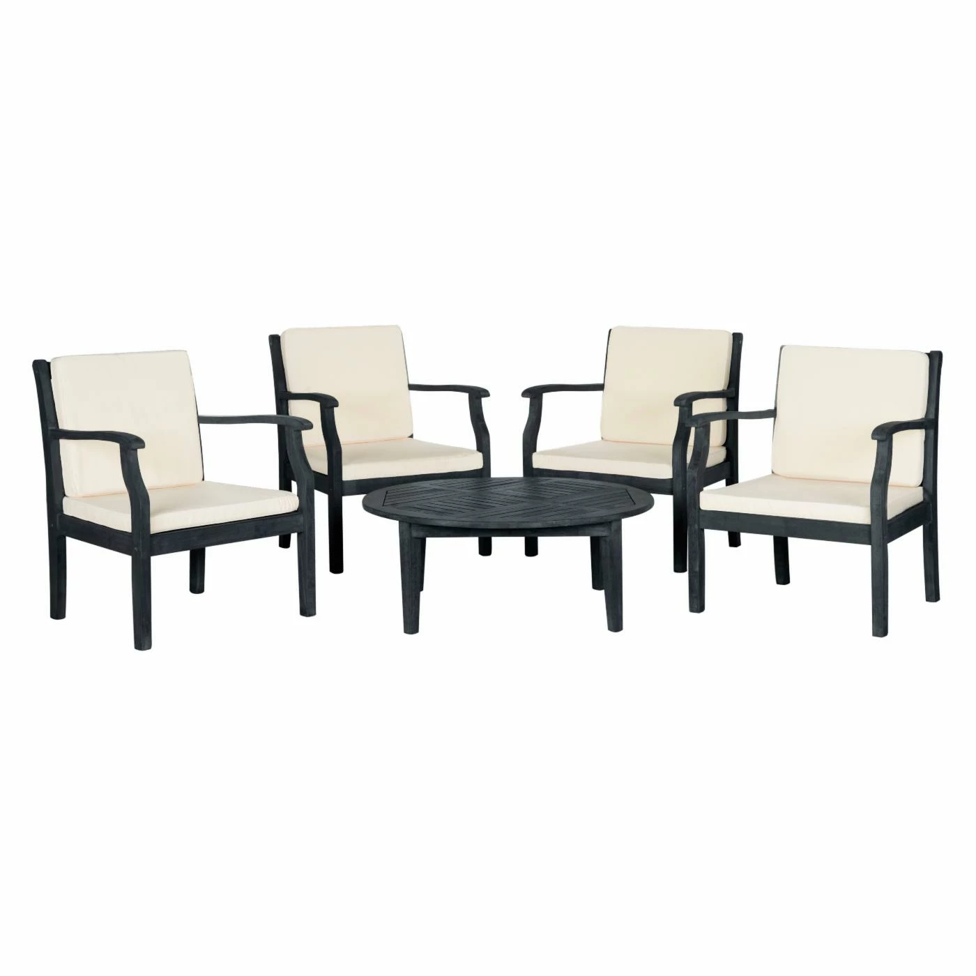 The dark slate gray Safavieh Anaheim Coffee Table Set offers comfortable seating for four. It comes with sturdy block-leg chairs that have smooth, flat arms and English-inspired crosshatch designs on the back. Plus, the chairs have cozy beige cushions upholstered with durable, all-weather fabric. The round table boasts a lineated hexagonal design, which adds style and texture to the set.