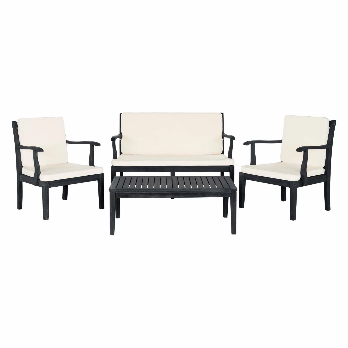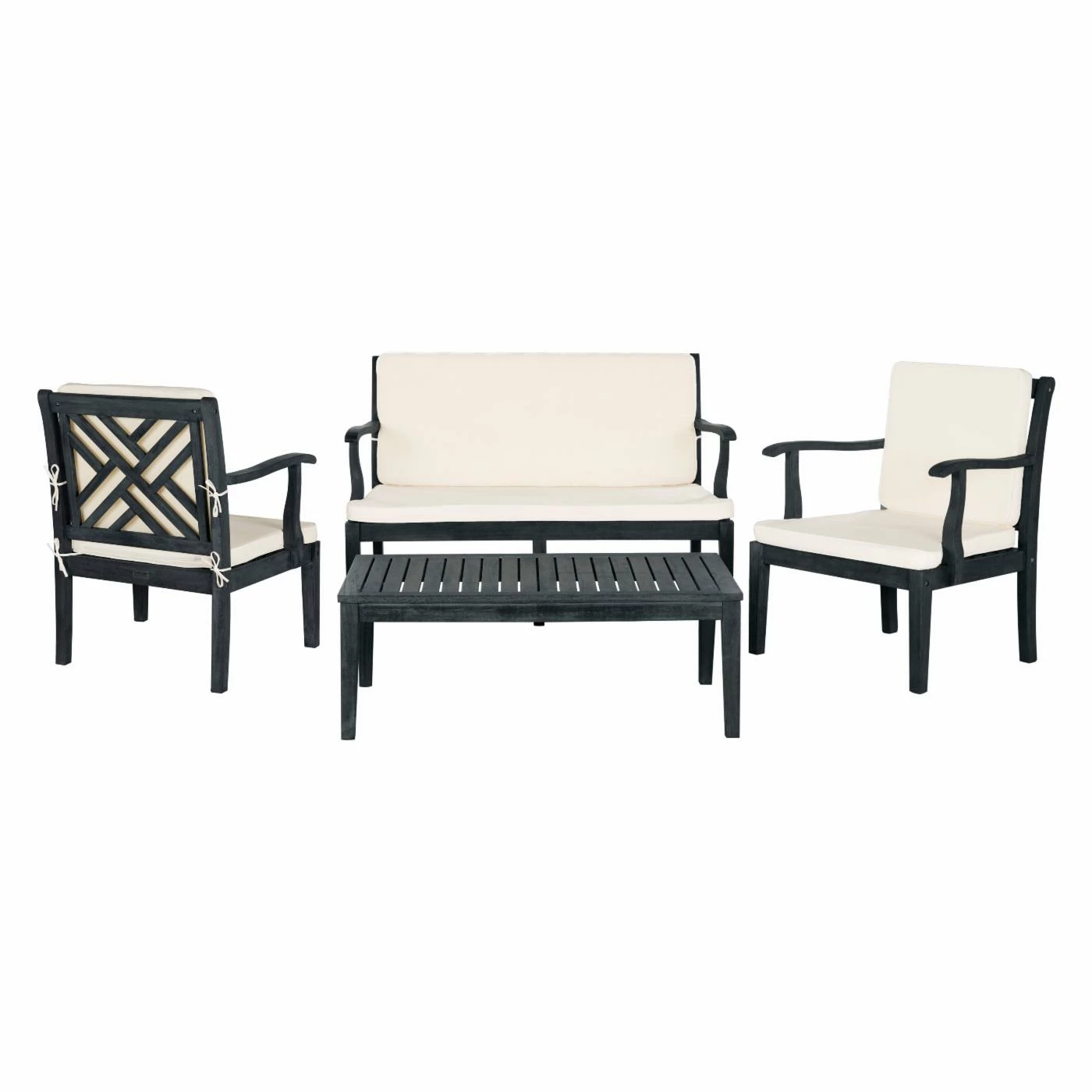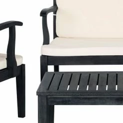 The Safavieh Bradbury 4 Piece Outdoor Conversation Set includes a rectangular table, bench, and two chairs. All of the pieces are durably crafted from acacia wood and supported by sturdy square legs. The seats have crosshatch detail on the backs, revealing their English influence, and they host plush all-weather cushions. The beige fabric paired with the wood’s dark slate gray finish creates an eye-catching yet versatile two-tone look.