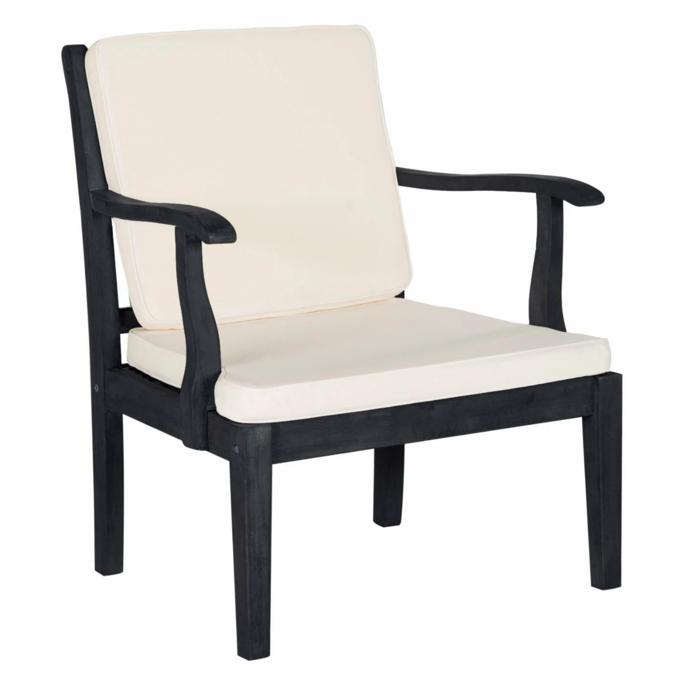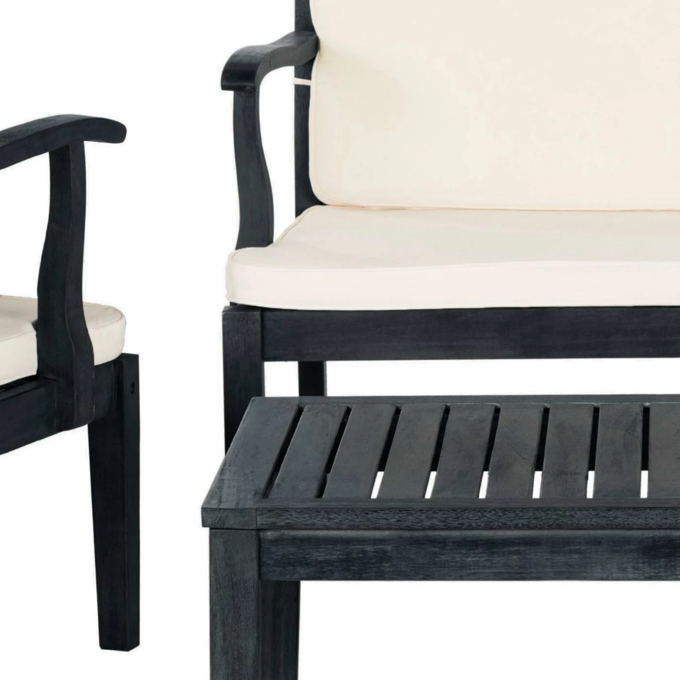 - Dark slate gray finish paired with beige cushions