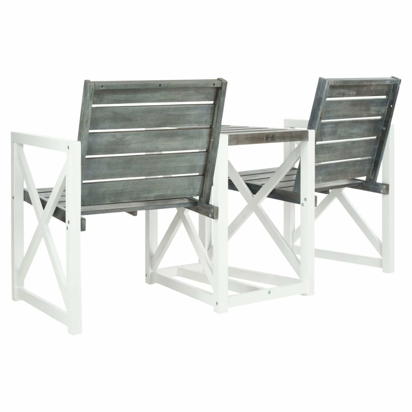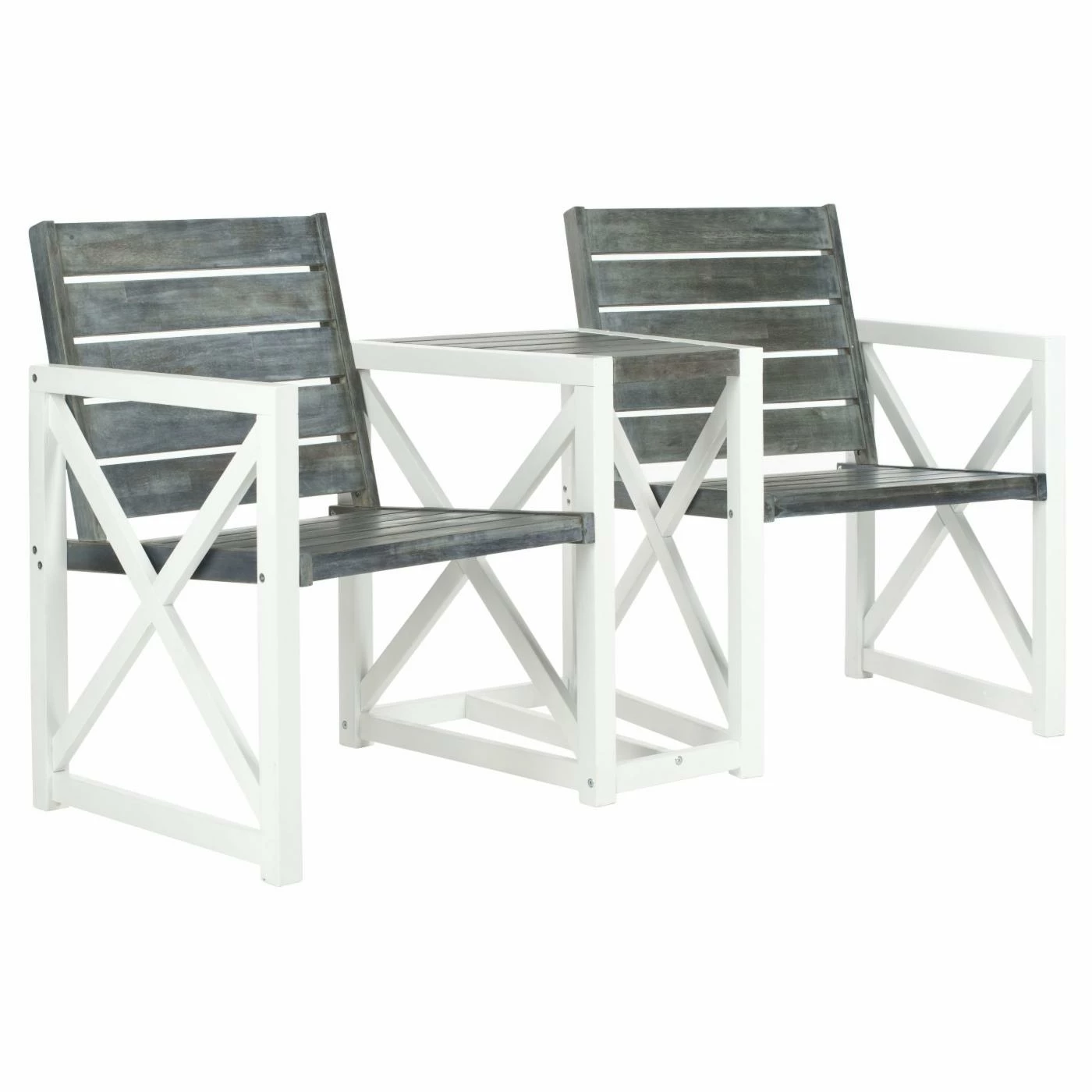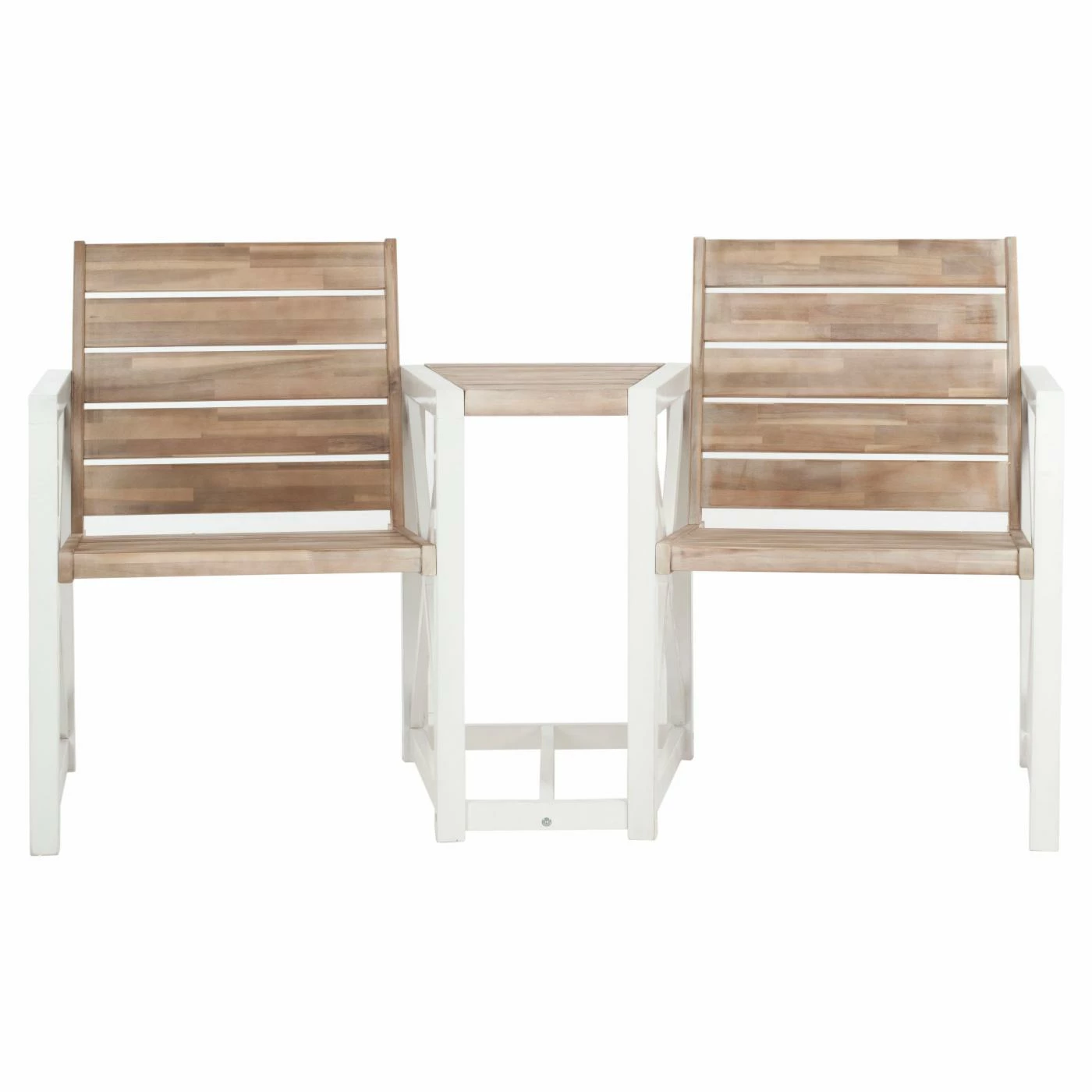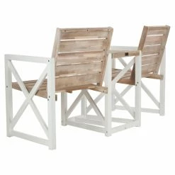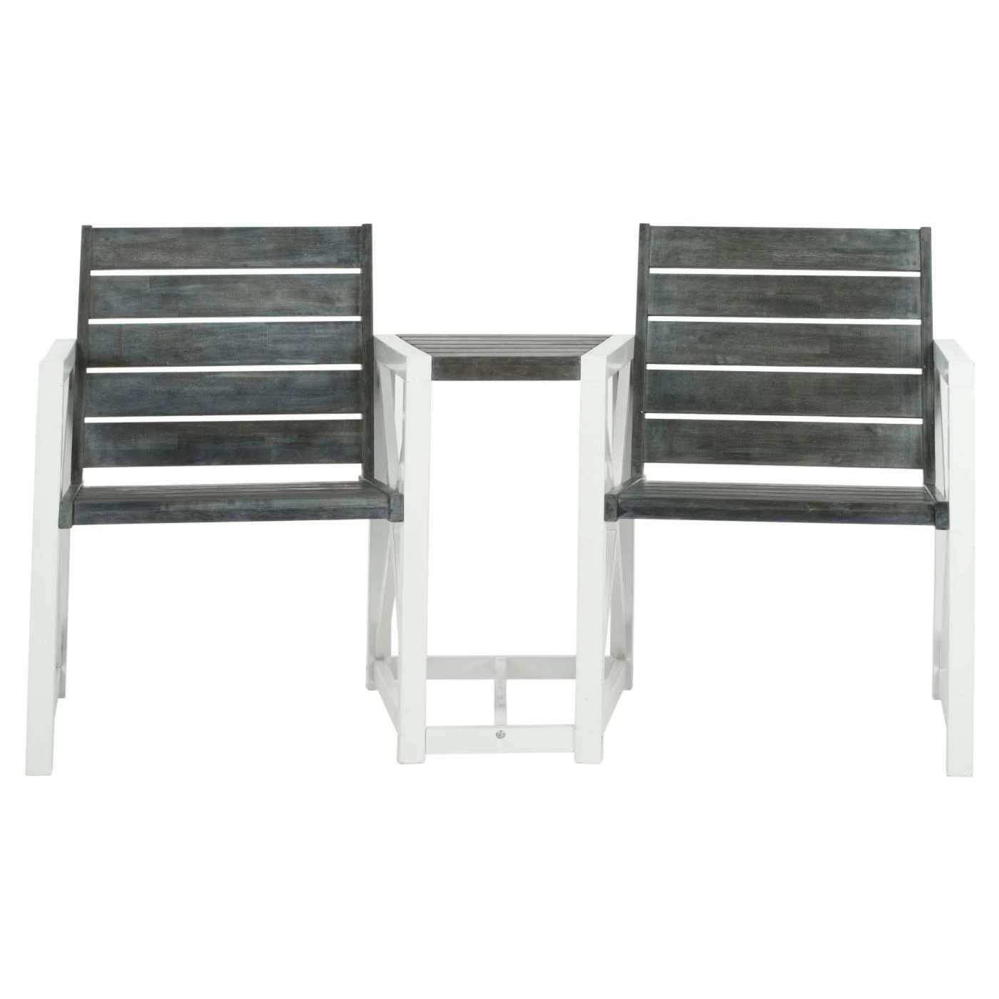 Never has going head-to-head been so convenient or convivial as it is with the Safavieh Jovanna Tete-a-Tete Chat Bench. This handsome bench gives you and a friend a companionable setting to stage a meeting of the minds. With two comfortable seats slightly angled toward one another and a small tabletop between them, just right for drinks, this bench easily establishes an entire self-contained outdoor conversation area. Dimensions: 62.2L x 26.5W x 33.8H inches. Each seat measures: 20L x 19W inches. Product weight: 58.5 lbs.