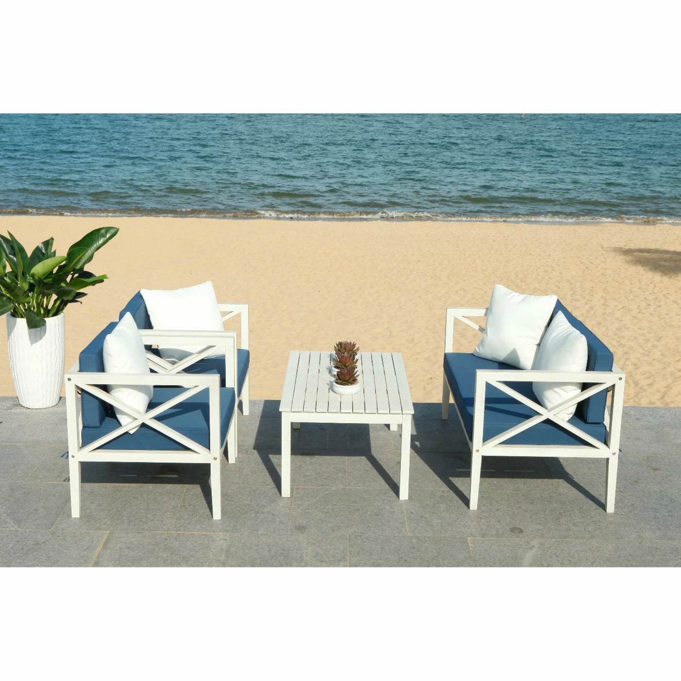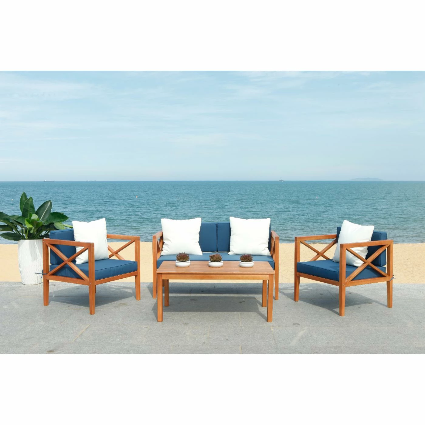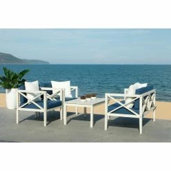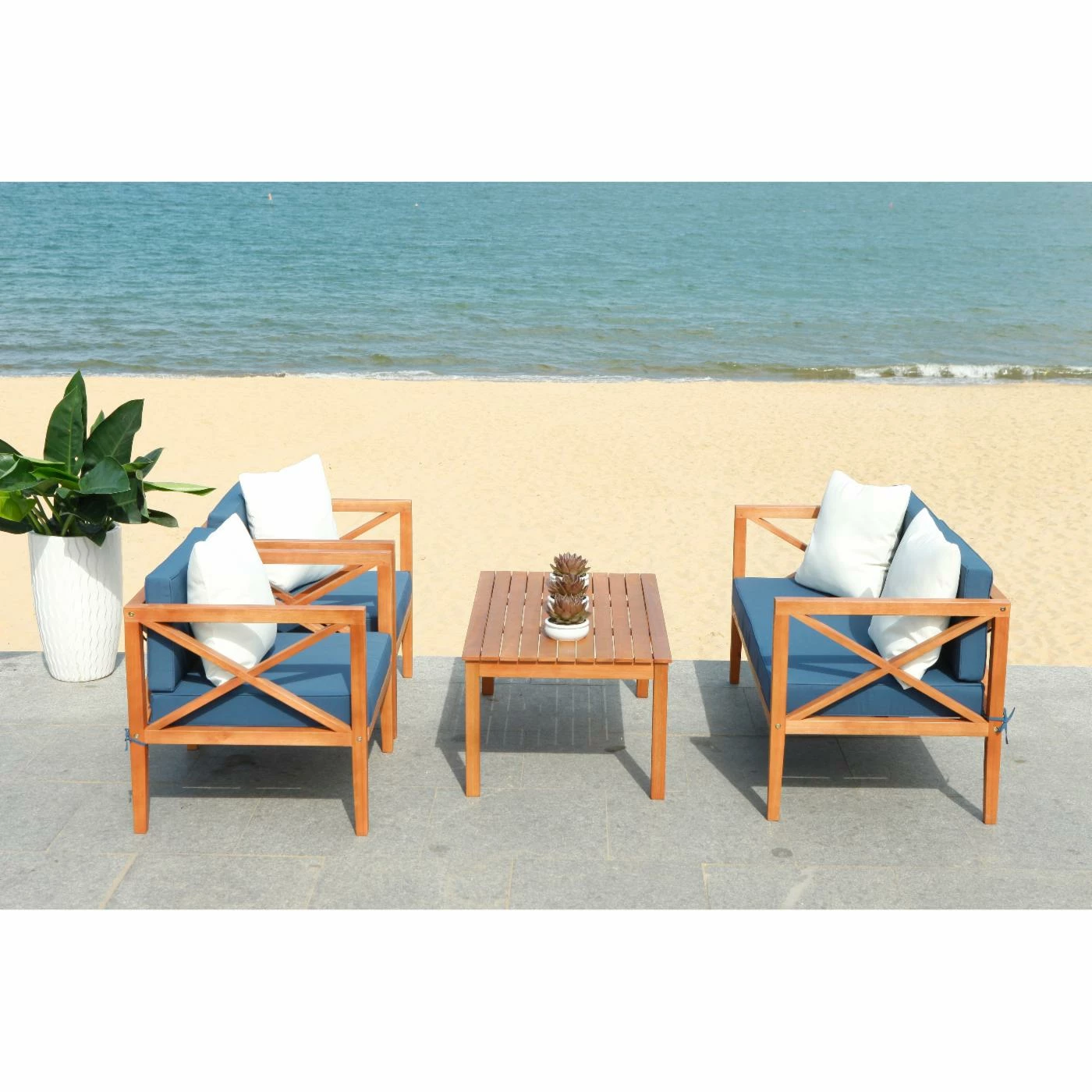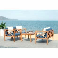 The Safavieh Nunzio Wooden 4 Piece Patio Conversation Set makes a fantastic Cape Cod style addition to your outdoor furniture set. This set includes a coffee table, two chairs, and a bench seat. Each piece comes constructed from hardy eucalyptus wood with block legs. The seats all feature open X-shaped sides with foam-padded seat- and backrest cushions for wonderful comfort. All-weather polyester fabric upholsters the cushions. Choose from the available finish options.