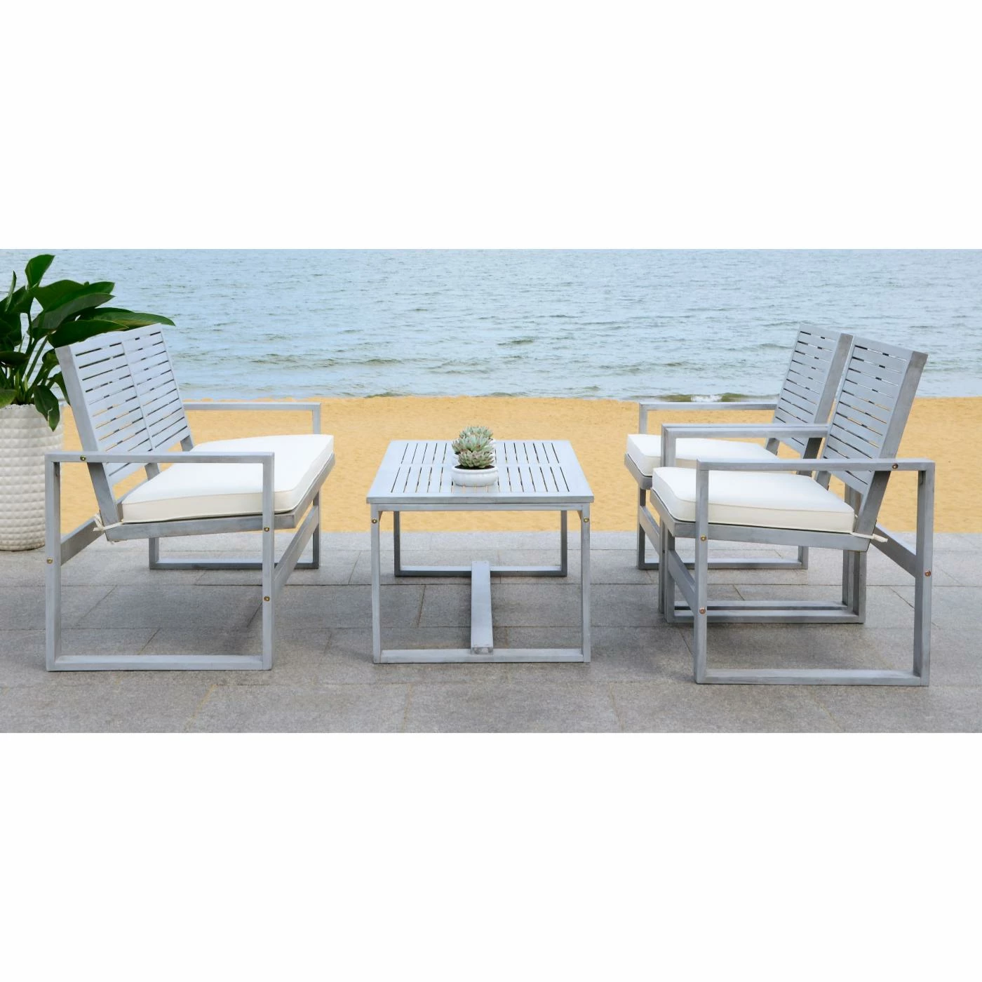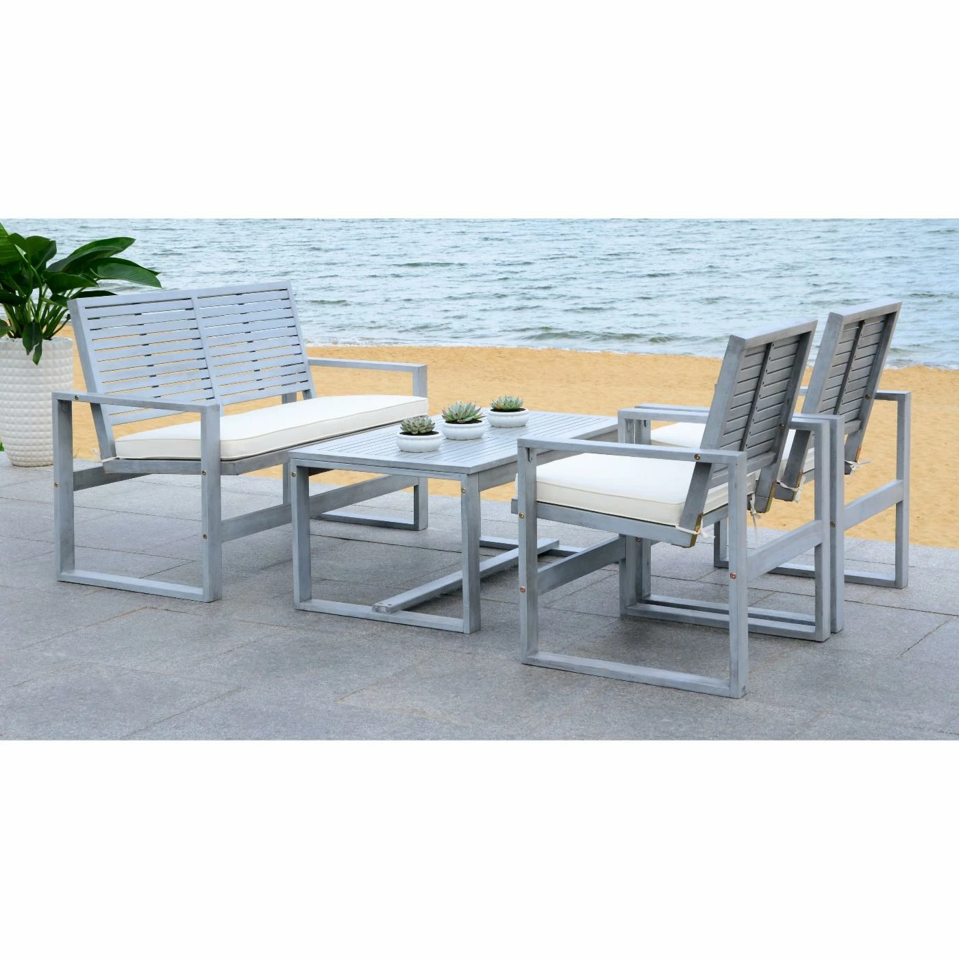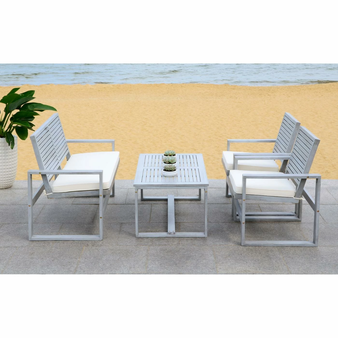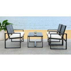 The contemporary and comfortable Safavieh Ozark 4 Piece Conversation Set includes four pieces and seats three to four people. The set is built of acacia wood and offered in your choice of available finish. Beige, water-resistant seat cushions and a handy coffee table make this patio chat set comfortable.
