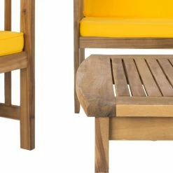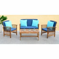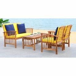 For a pop of bright color and luxurious comfort, add the Safavieh Rocklin 4 Piece Conversation Set to your patio, deck, or poolside area. This acacia wood chat set comes in a teak finish and is detailed with smart slats that are stylish and allow water to glide through. Tie-on, water-resistant cushions come in your choice of available color.