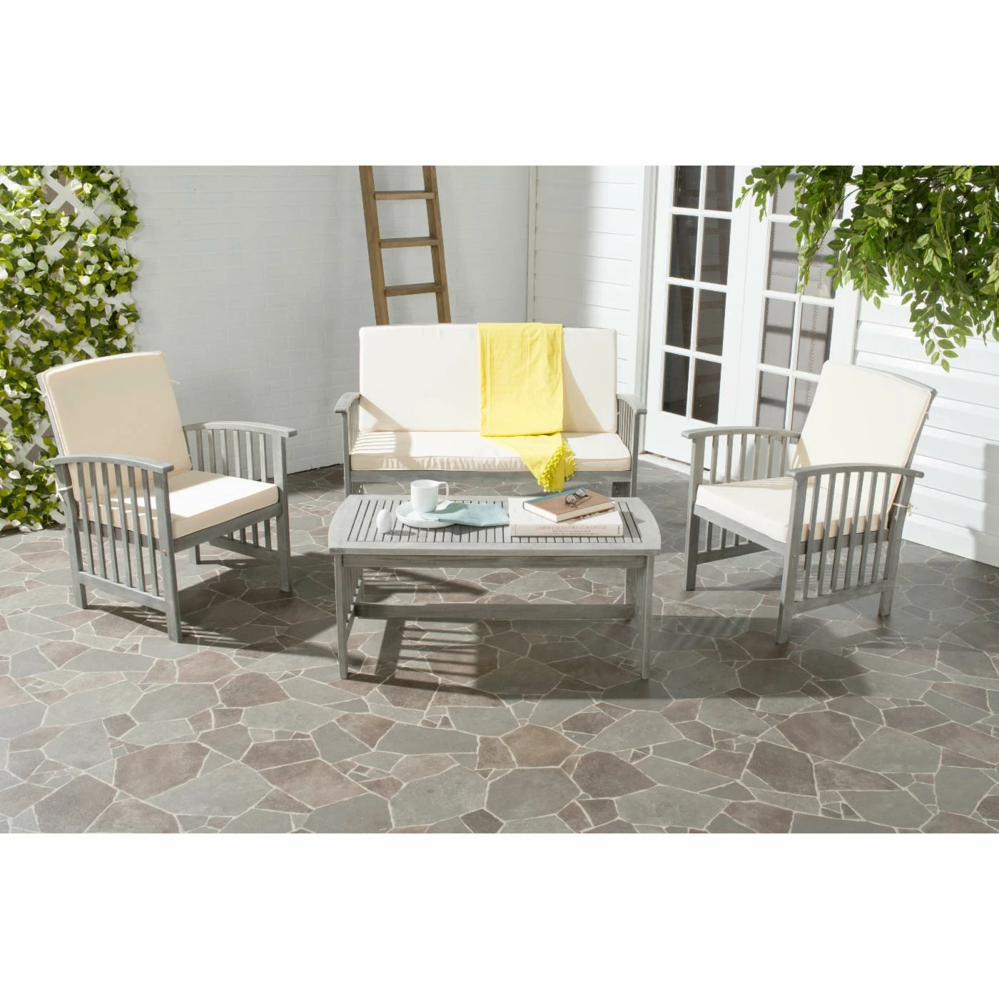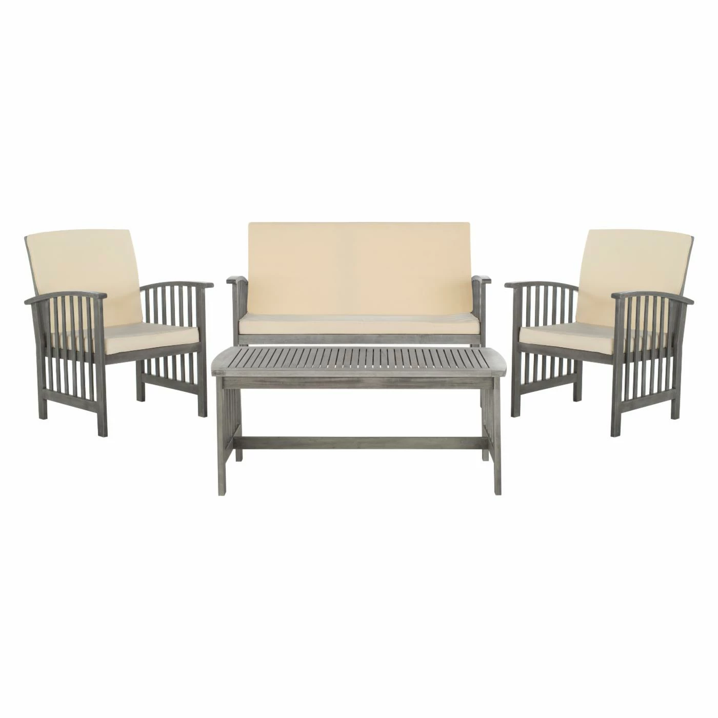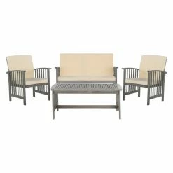 The Safavieh Rocklin 4 Piece Outdoor Conversation Set radiates charming farmhouse elegance. The loveseat, chairs, and table boasts weather-resistant acacia wood craftsmanship. The all-weather polyester pillows are plush for comfort and sport a soothing beige color. The soothing gray pieces in this conversation set are complete with slatted designs, which are excellent for rain drainage.