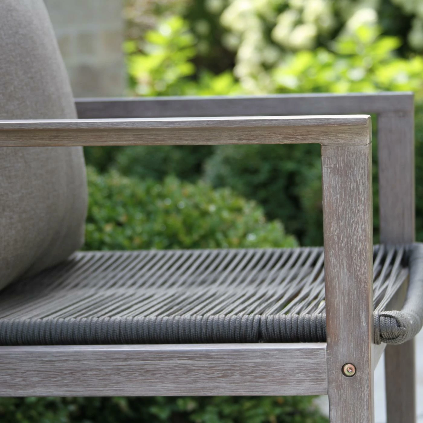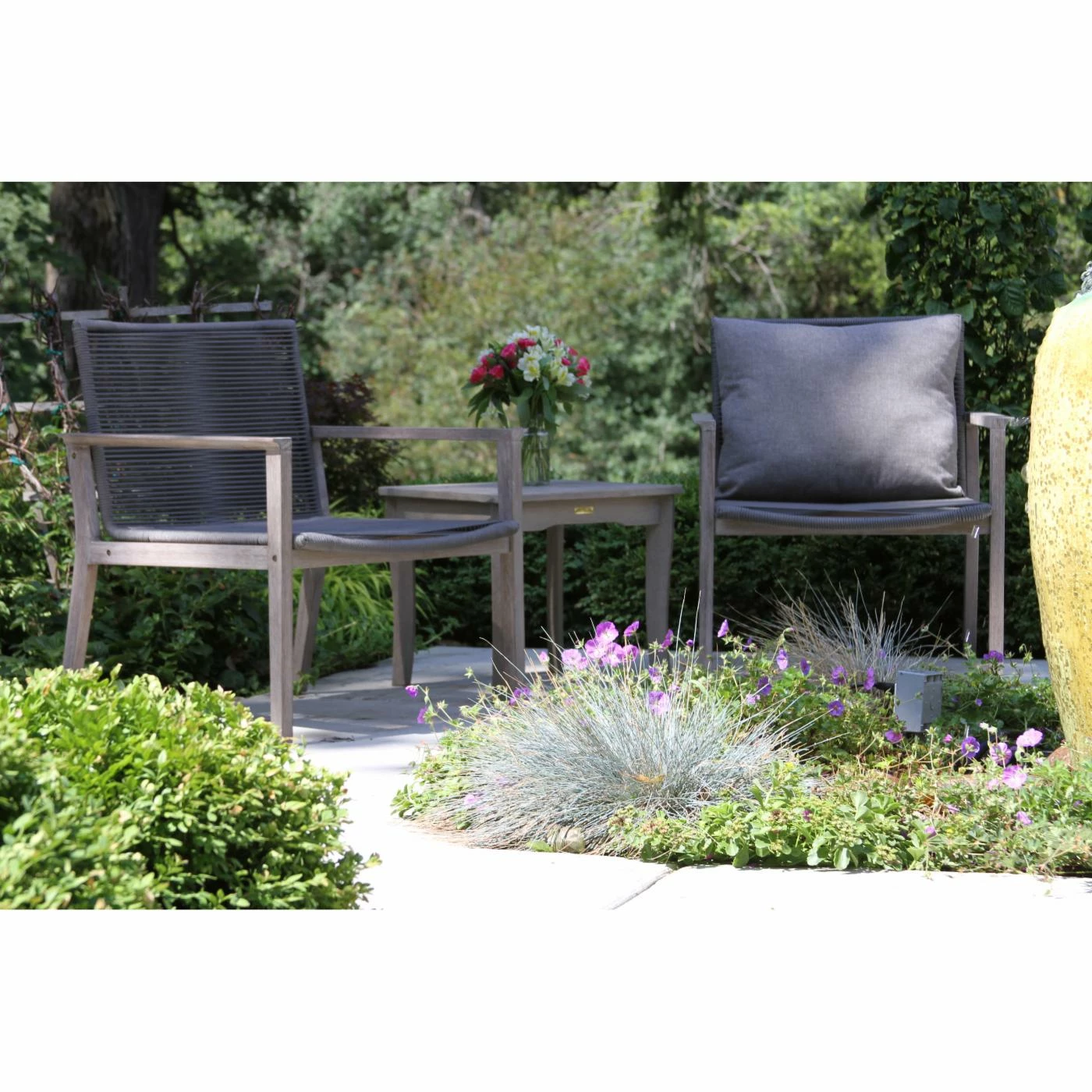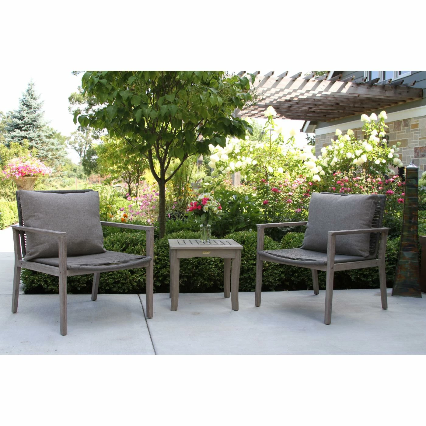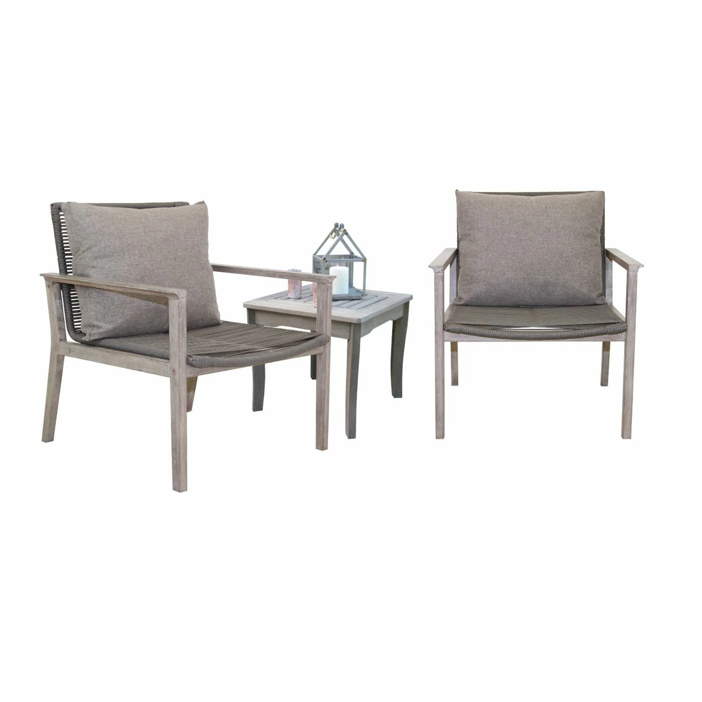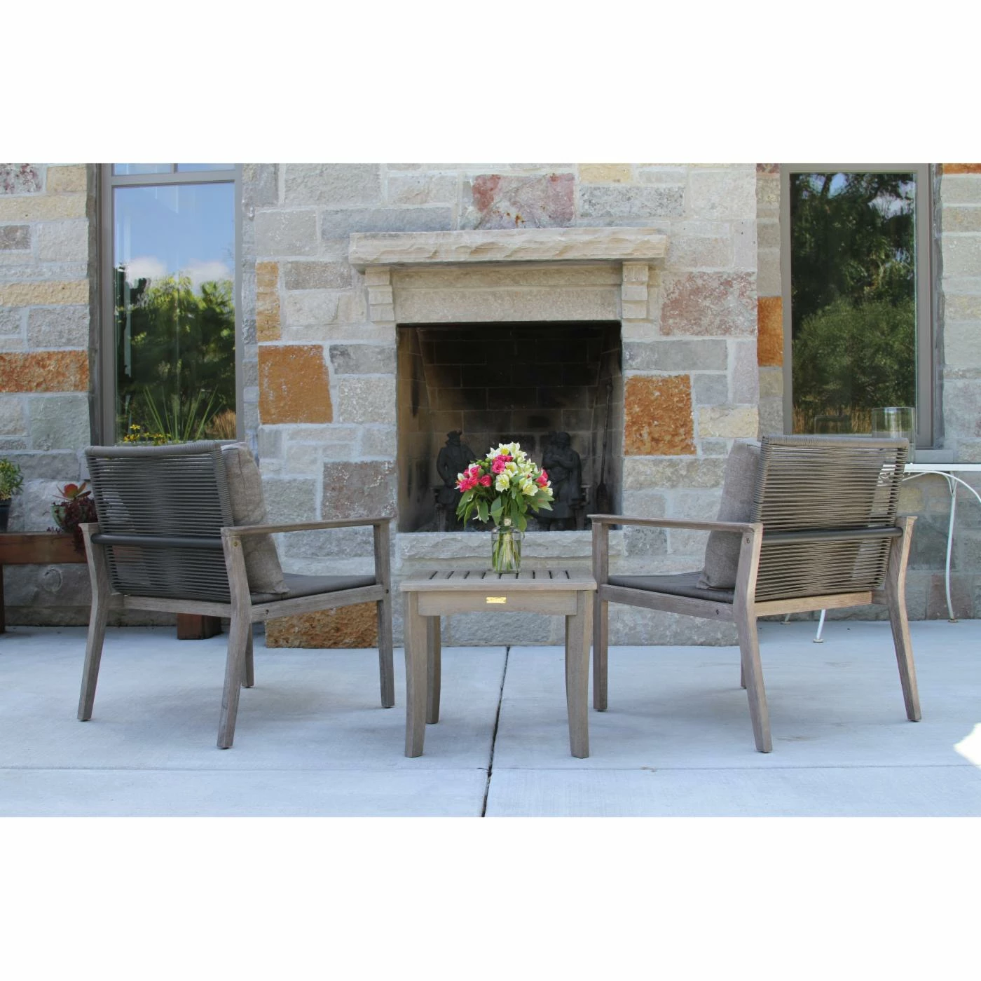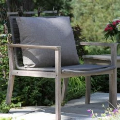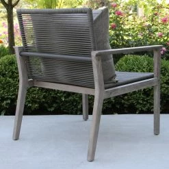 The Vineyard 3 Piece Eucalyptus and Rope Outdoor Lounge Chair Conversation Set with Square Accent Table is made from sustainable, plantation-grown eucalyptus and premium double spun UV stabilized polyester fiber with inner nylon cord reinforcement for strength and lasting durability. This set comprises many mixed materials and is finished in a gray wash color to create an elegant look.