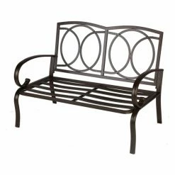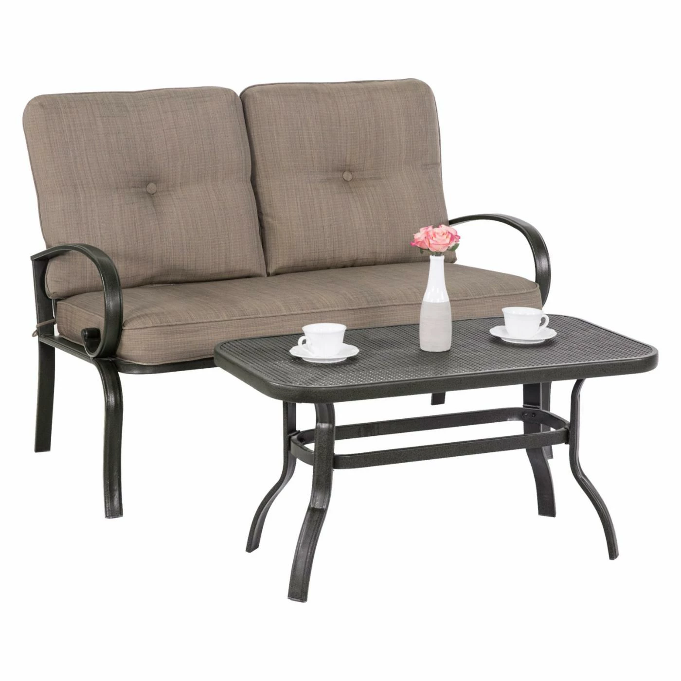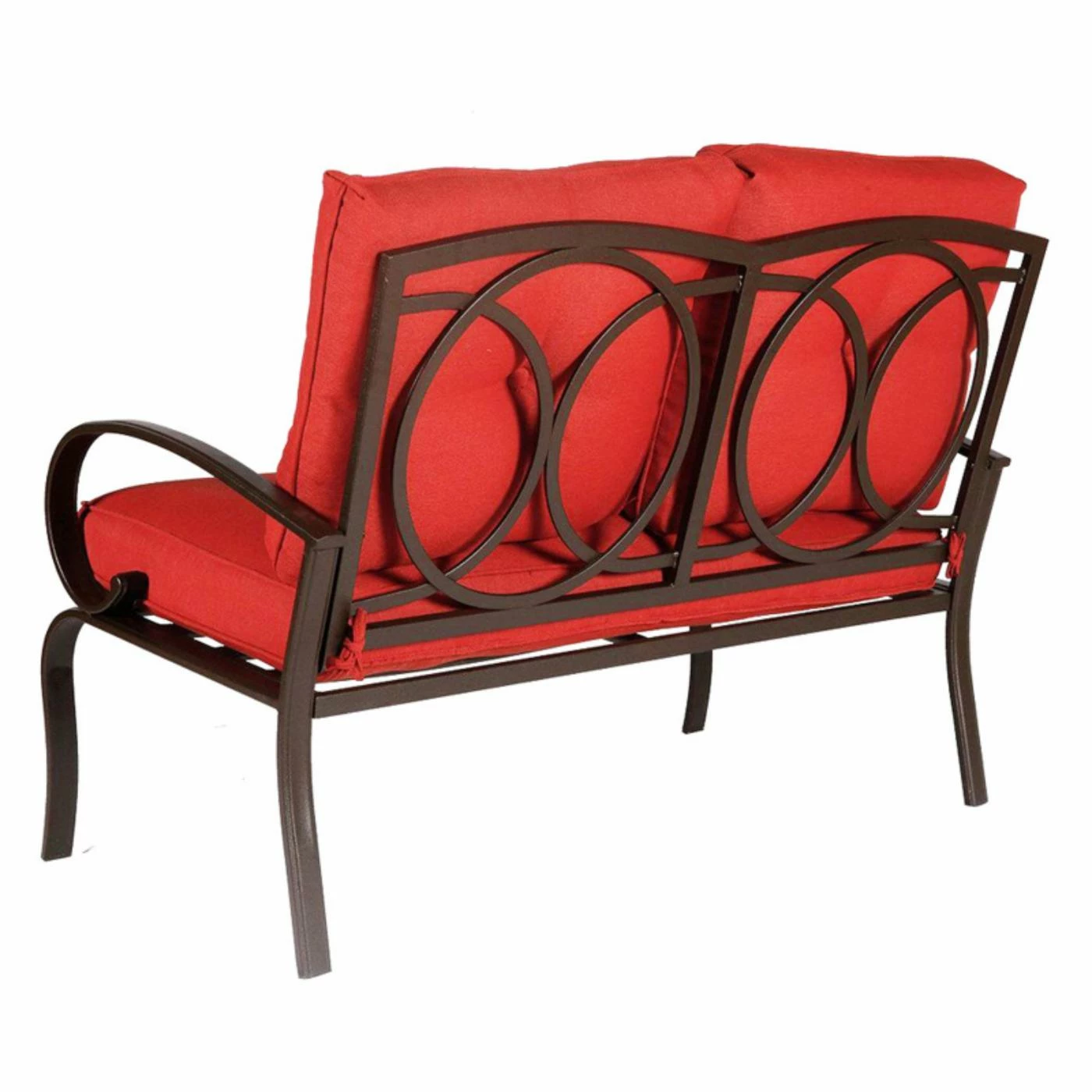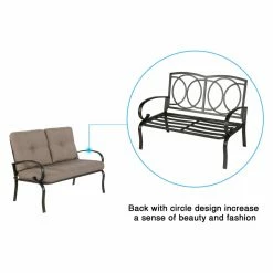 The Cloud Mountain Garden Wrought Iron 2 Piece Outdoor Love Seat Conversation Set is a fantastic way to add a cozy touch to large and small outdoor spaces alike. This set includes a loveseat with cushions and a matching coffee table. Each piece is made from iron with a powder-coated finish of dark bronze. The roomy design of the loveseat is enhanced by the cotton-filled seat cushions. Curved arms, a contoured seat, and a tall back add to the comfort. The table has a simple top of tight mesh that makes it easy to use and easier to clean. Please choose from available cushion color options.