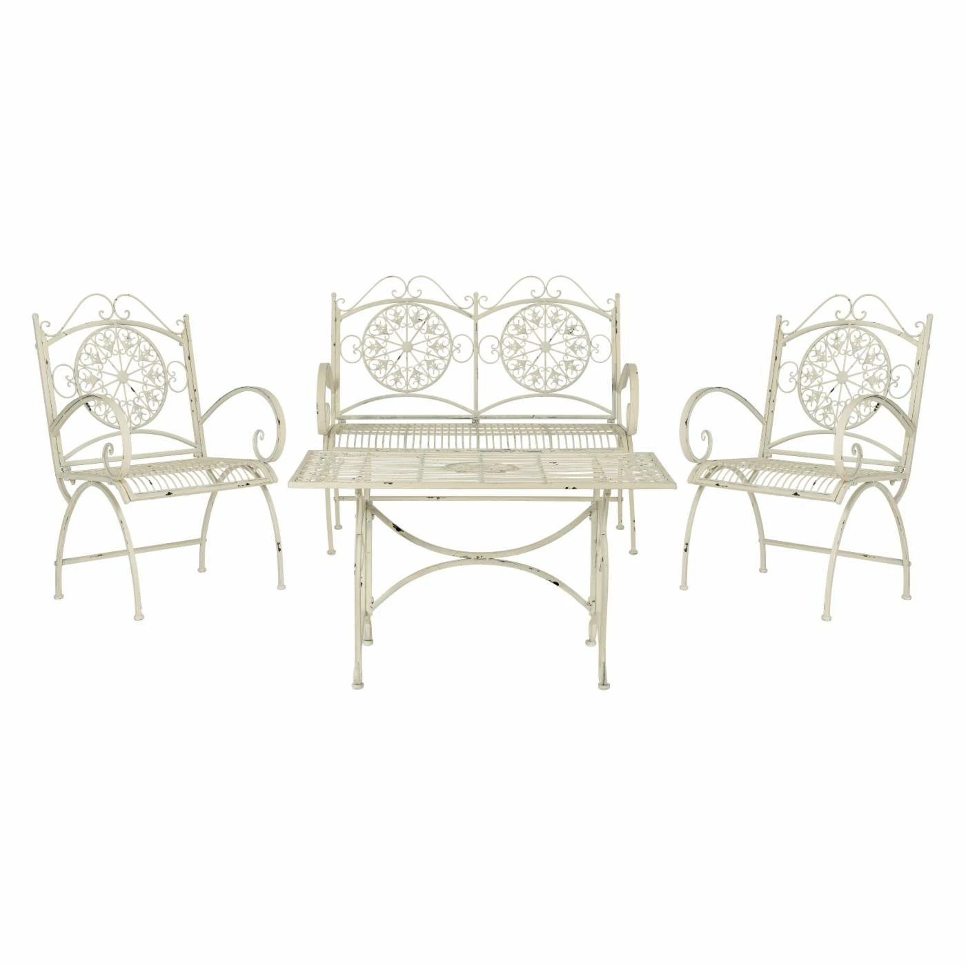 Feel like you’re lounging in the Victorian era with the Safavieh Sophie 4 Piece Outdoor Conversation Set. The chairs, loveseat, and table boast wrought iron craftsmanship that’s designed to endure the elements. Distressed detailing gives this conversation set a charming weathered look. Set it in a garden, porch, or deck to complete your outdoor lounging space.